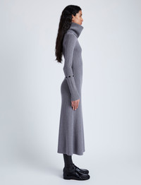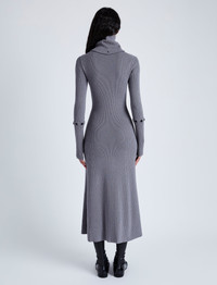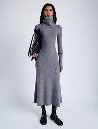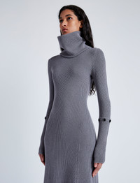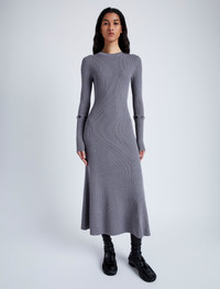 The Jocelyn Dress in Midweight Viscose Rib features a slim A-line silhouette with a crew neckline, buttoned lower back band and removable sleeve ends. Designed for transitional weather, this style includes a button at the center back neck used to attach a tonal tube scarf for a high neck finish. Details - Grey - Rib knit - Crew neck - Attachable tube scarf included - Long sleeve - Buttoned sleeve ends - Buttoned back band - Mid-length hem - A-line silhouette - Slim fit - 55% viscose, 37% wool, 8% polyester - SKU: R2447204KY326011 Size & Fit - Model is 5'9'' with 30'' bust / 34.5'' hips. Wearing size Small Care - 55% viscose, 37% wool, 8% polyester - Dry clean only
