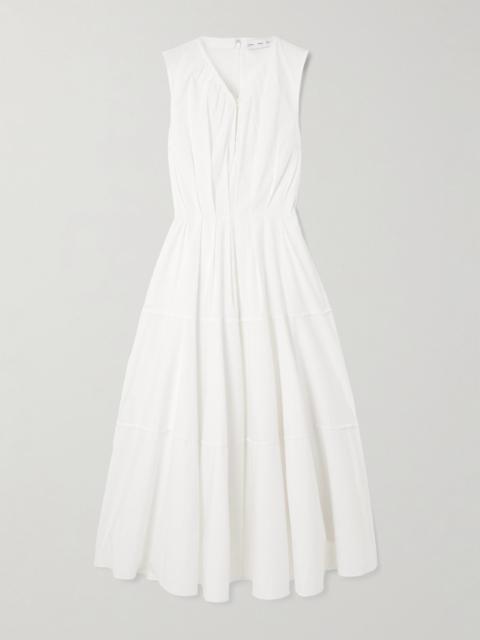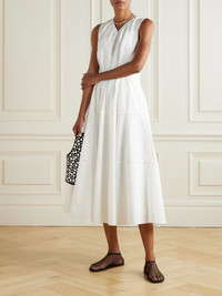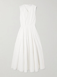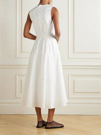 Proenza Schouler White Label's 'Kailey' dress is designed with a focus on the pleated V-neckline and nipped-in waist, which create dimension and a contemporary edge. It's made from cotton-blend poplin that's crisp and gently structured. Size & Fit - Fits true to size, however those who are between sizes should take the smaller size - Cut to be slightly fitted at the bust and waist, loose at the hip - Lightweight, non-stretchy fabric - Model is 180cm/ 5'11" and is wearing a US 2 Model measurements: - Bust: 86cm/ 34" - Waist: 65cm/ 25.5" - Hip: 90cm/ 35.5" Details & Care - White cotton-blend poplin - Concealed hook and zip fastening at back, button-fastening keyhole at front - 98% cotton, 2% spandex; lining: 100% cotton - Fully lined - Dry clean