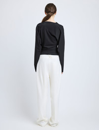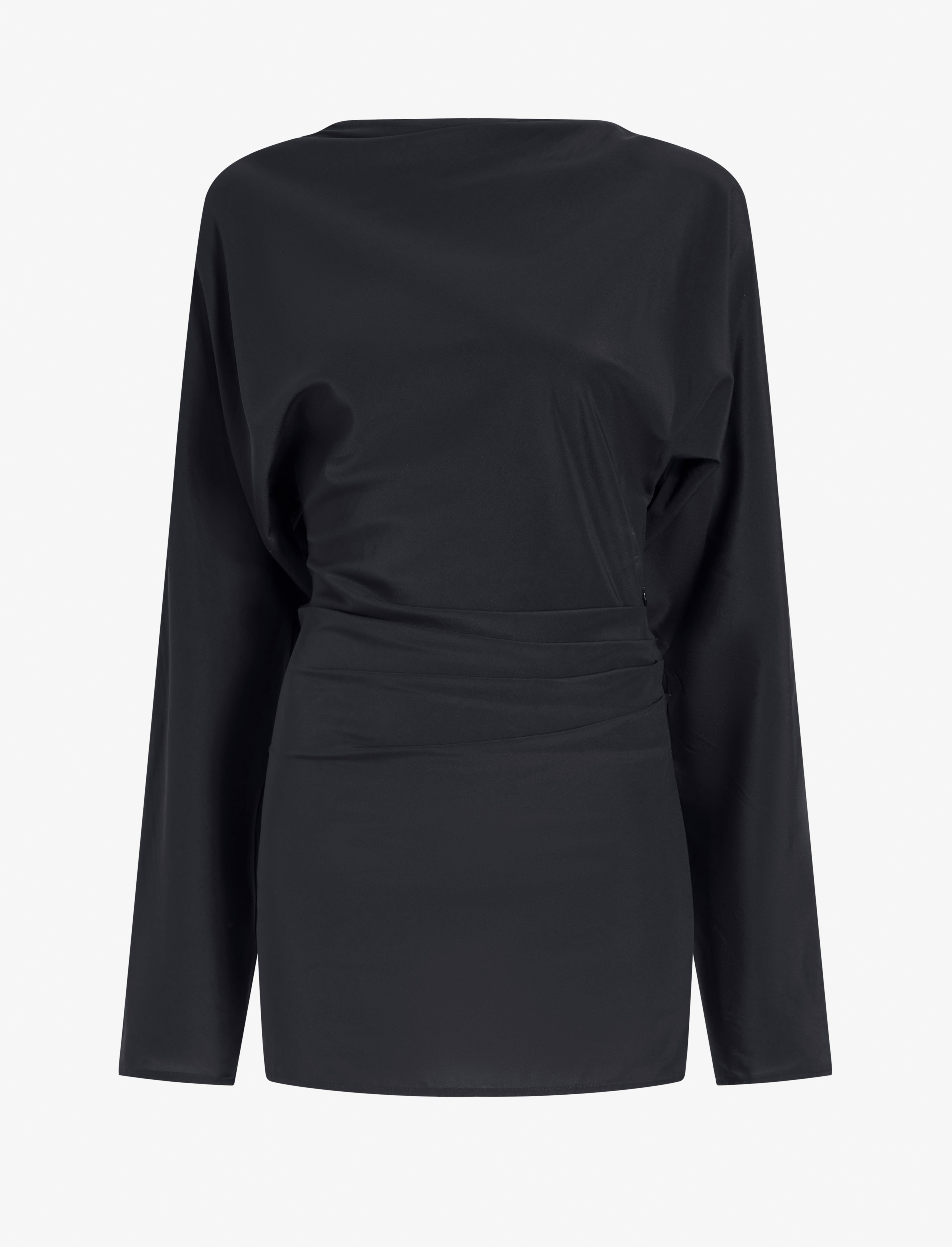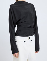 The Keegan Top in Stretch Silk Viscose is crafted to a slim silhouette, featuring a softly draped neckline and tapered sleeves. Completed with gathered pleats throughout the waist. Details - Black - Draped neckline - Long sleeves - Pleated waist - Side zipper closure - Straight hem - Slim fit - 50% viscose, 42% silk, 8% spandex - SKU: R2524002BY297001 Size & Fit - Model is 5'11'' with 30'' bust / 35.5'' hips. Wearing size 4 Care - 50% viscose, 42% silk, 8% spandex - Dry clean only