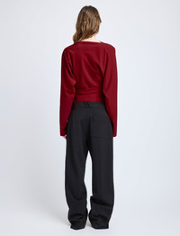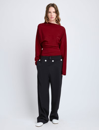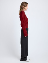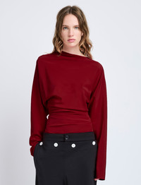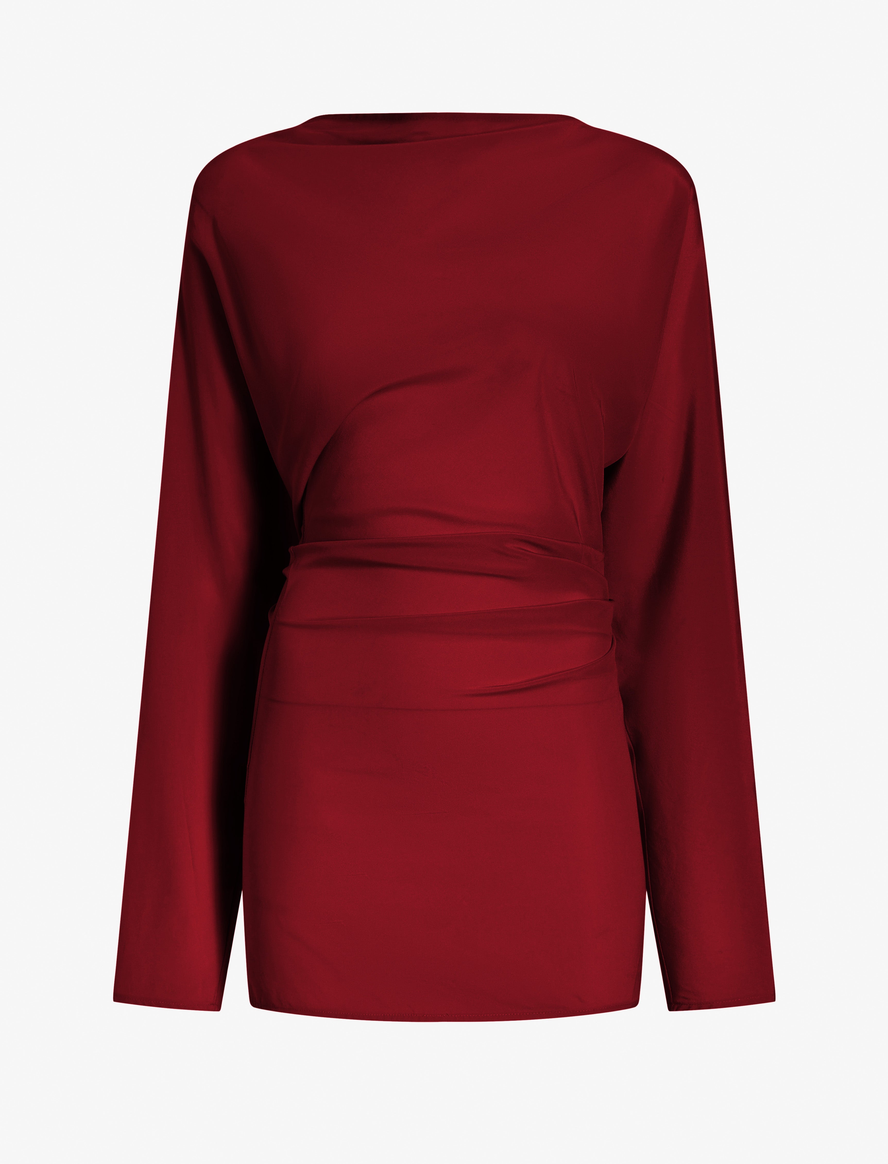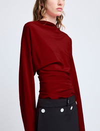 The Keegan Top in Stretch Silk Viscose is crafted to a slim silhouette, featuring a softly draped neckline and tapered sleeves. Completed with gathered pleats throughout the waist. Details - Red - Draped neckline - Long sleeves - Pleated waist - Side zipper closure - Straight hem - Slim fit - 50% viscose, 42% silk, 8% spandex - SKU: R2524002BY297600 Size & Fit - Model is 5'9.5'' with 32'' bust / 34'' hips. Wearing size 4 Care - 50% viscose, 42% silk, 8% spandex - Dry clean only