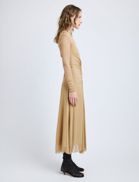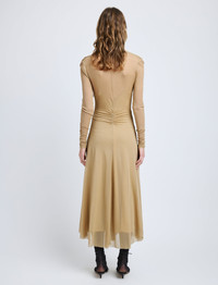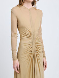The Kerstin Dress in Crepe Jersey is tailored to a slim A-line silhouette with an adjustable zipper neckline. Gathered ruching at the center front adds dimension, while an opaque V-neck slip is contrasted by a sheer long-sleeve overlay. Details - Khaki - Adjustable zipper neckline - Long sleeves - Gathered ruching - Deep V-neck slip - A-line silhouette - Dress: 83% viscose, 17% polyamide; Slip: 100% polyester - SKU: R2523030JY123255 Size & Fit - Model is 5'9.5'' with 32'' bust / 34'' hips. Wearing size 4 Care - Dress: 83% viscose, 17% polyamide; Slip: 100% polyester - Dry clean only