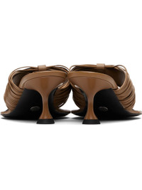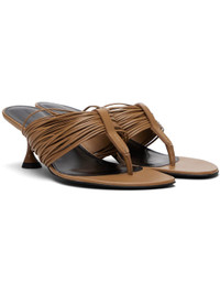 Buffed calfskin heeled sandals. · Open toe · Thong-style strap with gathered fringe detailing at vamp · Logo embossed at padded footbed · Kitten heel with rubber injection · Polished leather sole · Heel: H2.5" Supplier color: Khaki Upper: calfskin. Sole: leather. Made in Italy 252288F125001