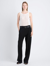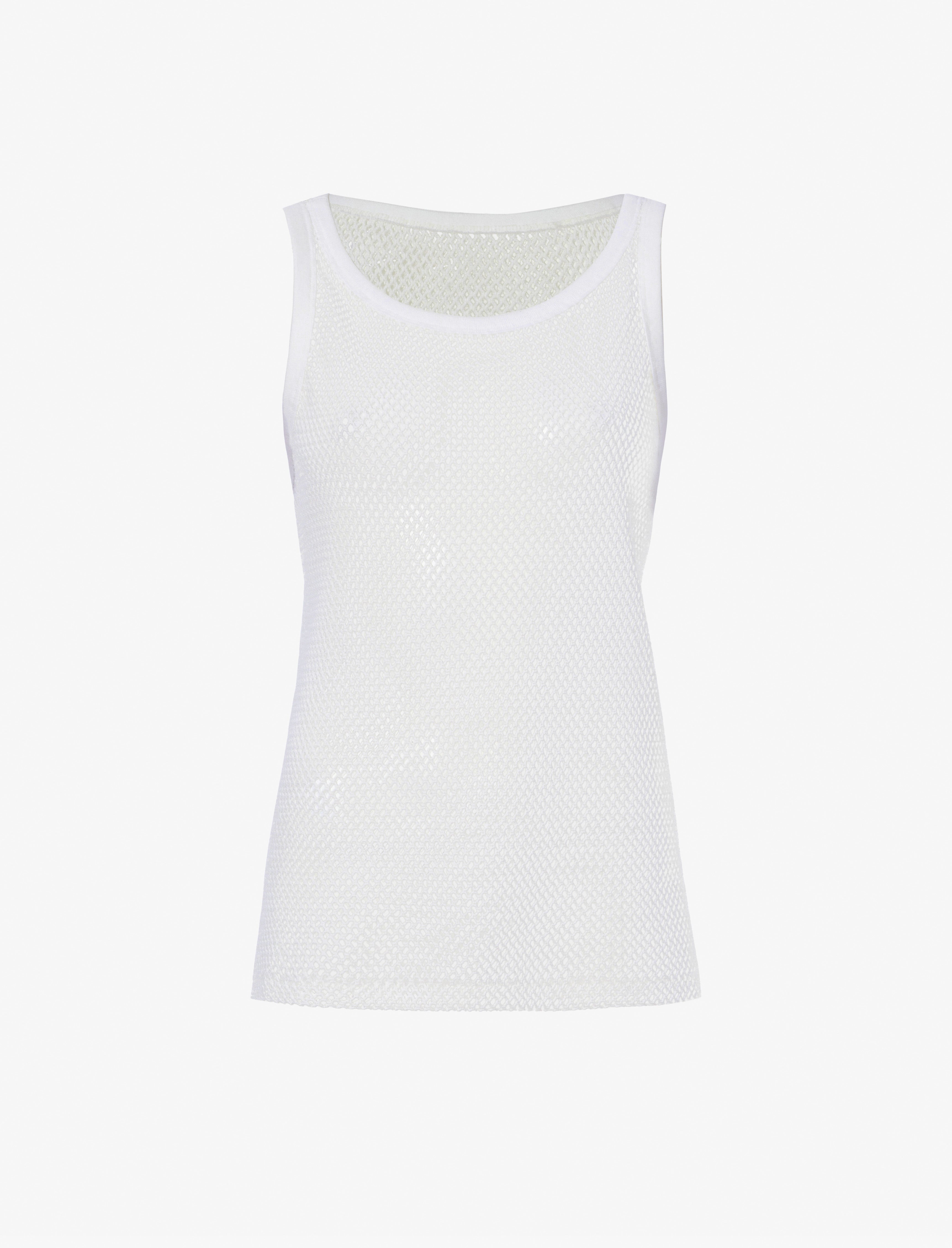 Spring 2024 Runway Collection | Look 4 The Kiki Tank in Cotton Mesh is crafted from subtly textured mesh to a relaxed yet tailored silhouette. Detailed with a crew neckline and solid border trims. Details • White • Mesh • Sheer • Crew neck • Sleeveless • Relaxed fit • 100% cotton • Made in the United States • SKU: R2424009JY105100 Size & Fit • Model is 5'11'' with 32'' bust / 35'' hips. Wearing size Small Care • 100% cotton • Dry clean only