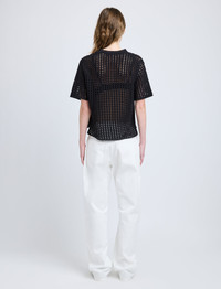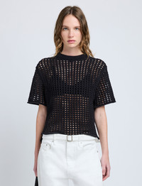 The Kimia Top in Open Crochet features a boxy short-sleeve silhouette with a patterned open knit. Details - Black - Open knit - Crew neckline - Short sleeves - Thick solid trim - Straight hem - Boxy silhouette - SKU: R2537247KC138001 Size & Fit - Model is 5'9.5'' with 32'' bust / 34'' hips. Wearing size Small