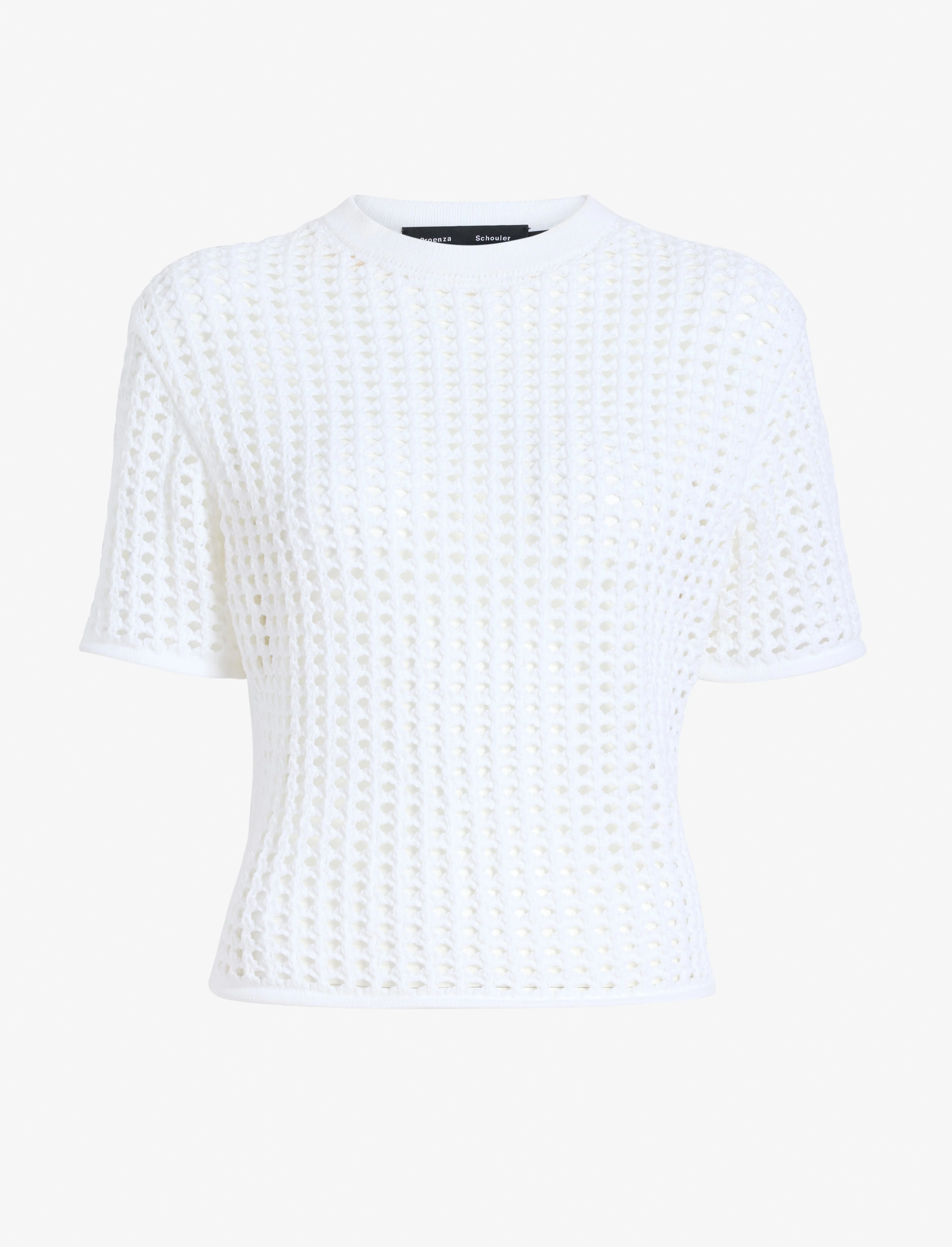 The Kimia Top in Open Crochet features a boxy short-sleeve silhouette with a patterned open knit. Details - Off white - Open knit - Crew neckline - Short sleeves - Thick solid trim - Straight hem - Boxy silhouette - SKU: R2537247KC138102 Size & Fit - Model is 5'9.5'' with 32'' bust / 34'' hips. Wearing size Small