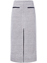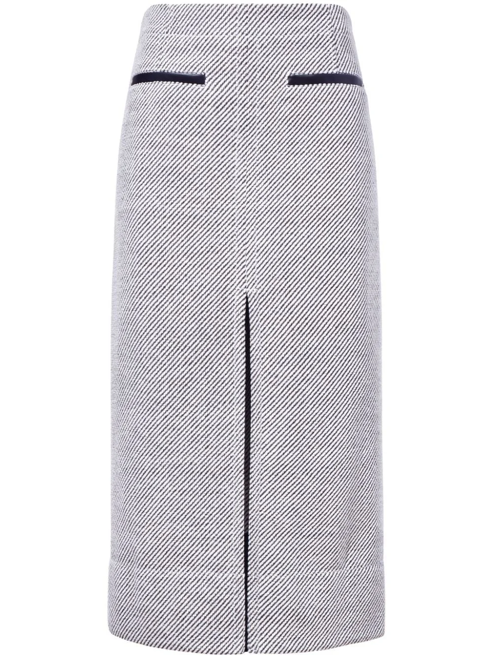 Kingsley midi skirt Highlights - Grey/white - Twill weave - Faux-leather trim - Concealed side zip fastening - Front slit - High-rise - Mid-length - Straight hem Imported Composition Polyester 67%, Wool 33% Washing instructions Read Manufacturer Guidelines