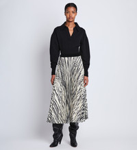 The Korine Skirt in Printed Sheer Pleated Chiffon is cut in sheer crepe to a slim silhouette and patterned with bold black stripes. Detailed with a contrasting ribbed-knit waistband and sharp pleats. Details • White, black • High ribbed-knit waist • Straight hem • Slim fit • Skirt: 100% polyester; Knit waistband: 83% viscose, 17% polyester • SKU: R2415010BYP284116 Size & Fit • Model is 5'11'' with 30'' bust / 35'' hips. Wearing size 4 Care • Skirt: 100% polyester; Knit waistband: 83% viscose, 17% polyester • Dry clean only