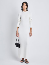 Spring 2024 Runway Collection | Look 15 The Lara Knit Dress In Viscose Boucle is cut to a long sleeve fitted silhouette with a round open cut back and high slit hem in the lower back body. Detailed with buttons along the back waistline that can be unclasped. Runway note: Details • White • Crew neck • Long sleeve • Cut-out back • Buttons along waistline • High slit hem • Maxi length • Fitted silhouette • 58% viscose, 42% polyamide • SKU: R2427143KY319100 Size & Fit • Model is 5'10'' with 29'' bust / 34'' hips. Wearing size Small Care • 58% viscose, 42% polyamide • Dry clean only
