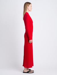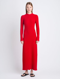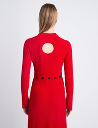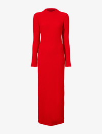 Spring 2024 Runway Collection | Look 17 The Lara Knit Dress In Viscose Boucle is cut to a long sleeve fitted silhouette with a round open cut back and high slit hem in the lower back body. Detailed with buttons along the back waistline that can be unclasped. Details • Red • Crew neck • Long sleeve • Cut-out back • Buttons along waistline • High slit hem • Maxi length • Fitted silhouette • 58% viscose, 42% polyamide • SKU: R2427143KY319600 Size & Fit • Model is 5'11'' with 32'' bust / 35'' hips. Wearing size Small Care • 58% viscose, 42% polyamide • Dry clean only