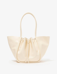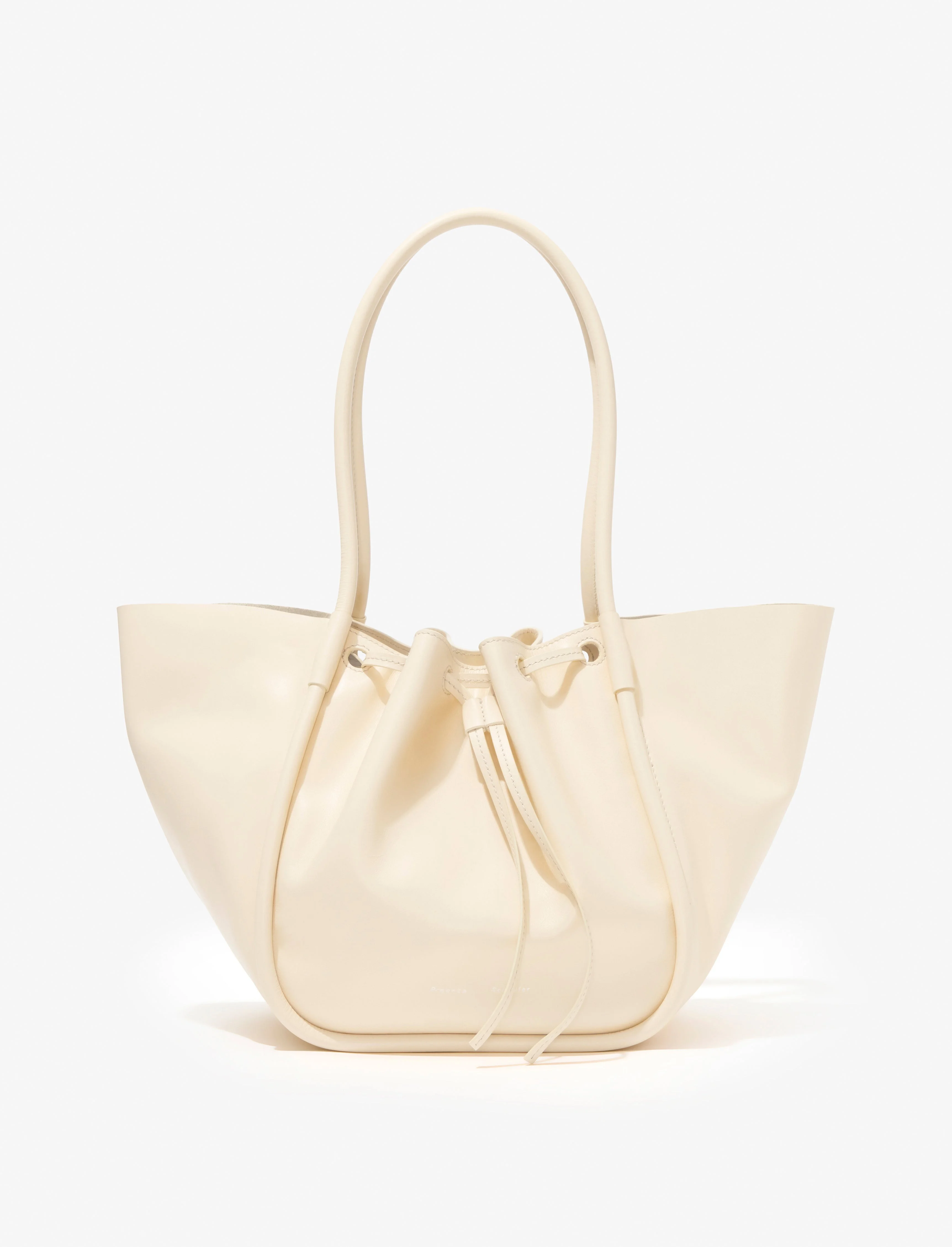 Designed for a soft, unstructured silhouette, the Large Ruched Tote is crafted using soft shiny calf leather. Featuring a ruched top and the signature gold-tone logo stamp. Complete with an internal leather zip pouch. Details - Birch - Two handles - Open top with magnetic fastening - Gold-tone logo stamp - Unlined interior - Internal zip pouch - 100% calfskin - SKU: HB243067C524S756 Size & Fit - W: 50cm x H: 27cm x D: 19cm - Top Handle Height: 25cm Care - 100% calfskin - Our bags are hand crafted using genuine leather. Variations in tone, marks or grain are common and should not be considered imperfections. Like all natural materials, leather reacts to the atmosphere. Humidity, rain, and sunlight can damage leather. Should a slight white coating appear on the surface of the leather, it can easily be removed using a dry cloth. Should the leather get wet, please absorb the water immediately with a dry cloth. Overexposure to sunlight can stain or alter the color of the leather.