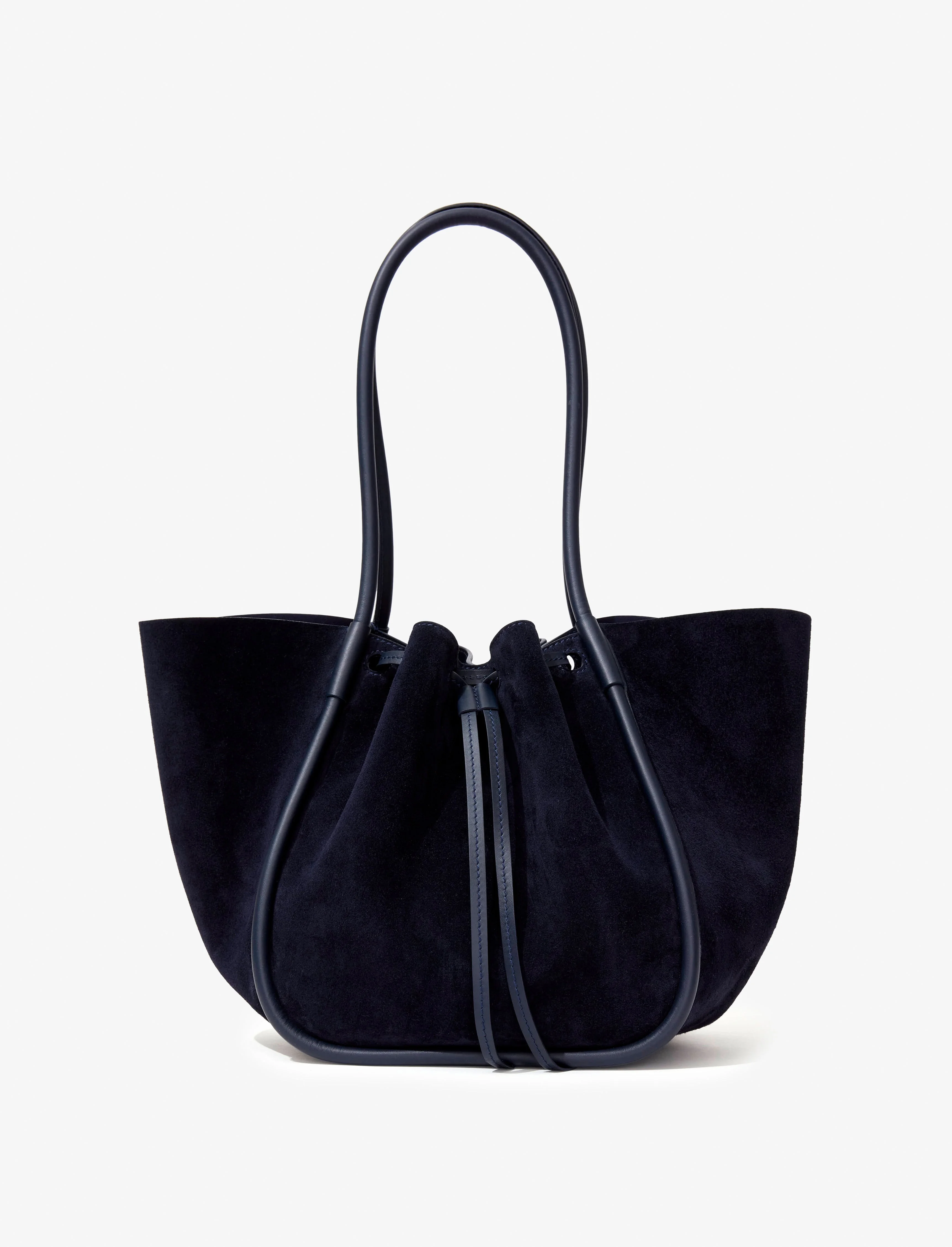 Designed for a soft, unstructured silhouette, the Large Ruched Tote is crafted using soft suede. Featuring a ruched top and the signature gold-tone logo stamp. Complete with an internal leather zip pouch. The Tote family consists of the Extra Small, Small, Large, and XL. Details - Deep Navy - Two handles - Open top with magnetic fastening - Gold-tone logo stamp - Unlined interior - Internal zip pouch - 100% calfskin - SKU: HB243067C012S417 Size & Fit - W: 50cm x H: 27cm x D: 19cm - Top Handle Height: 25cm Care - 100% calfskin - Our bags are hand crafted using genuine leather. Variations in tone, marks or grain are common and should not be considered imperfections. Like all natural materials, leather reacts to the atmosphere. Humidity, rain, and sunlight can damage leather. Should a slight white coating appear on the surface of the leather, it can easily be removed using a dry cloth. Should the leather get wet, please absorb the water immediately with a dry cloth. Overexposure to sunlight can stain or alter the color of the leather.