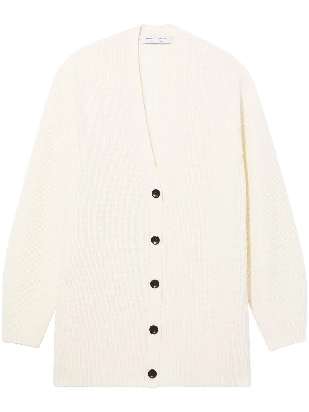 long-length knitted cardigan Proenza Schouler White Label presents this cardigan for a wardrobe essential. The design is presented in a soft cream-white wool knit for versatility. Imported Composition Wool 100% Washing instructions Dry Clean Only