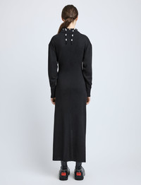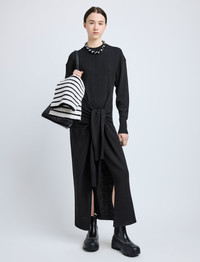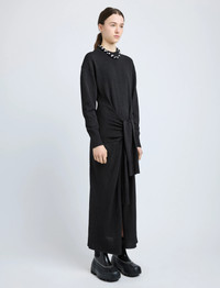 The Luca Dress in Silk Cotton Crepe Knit features a slim silhouette that drapes at the front with a gathered self-tie. Finished with a center split hem. Details - Black - Crew neckline - Long sleeves - Ribbed trims - Gathered self-tie - Split hem - Slim silhouette - 31% silk, 30% wool, 29% cotton, 10% nylon - SKU: R2527234KC142S001 Size & Fit - Model is 5'11'' with 30'' bust / 35.5'' hips. Wearing size Small Care - 31% silk, 30% wool, 29% cotton, 10% nylon - Dry clean only
