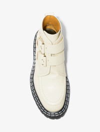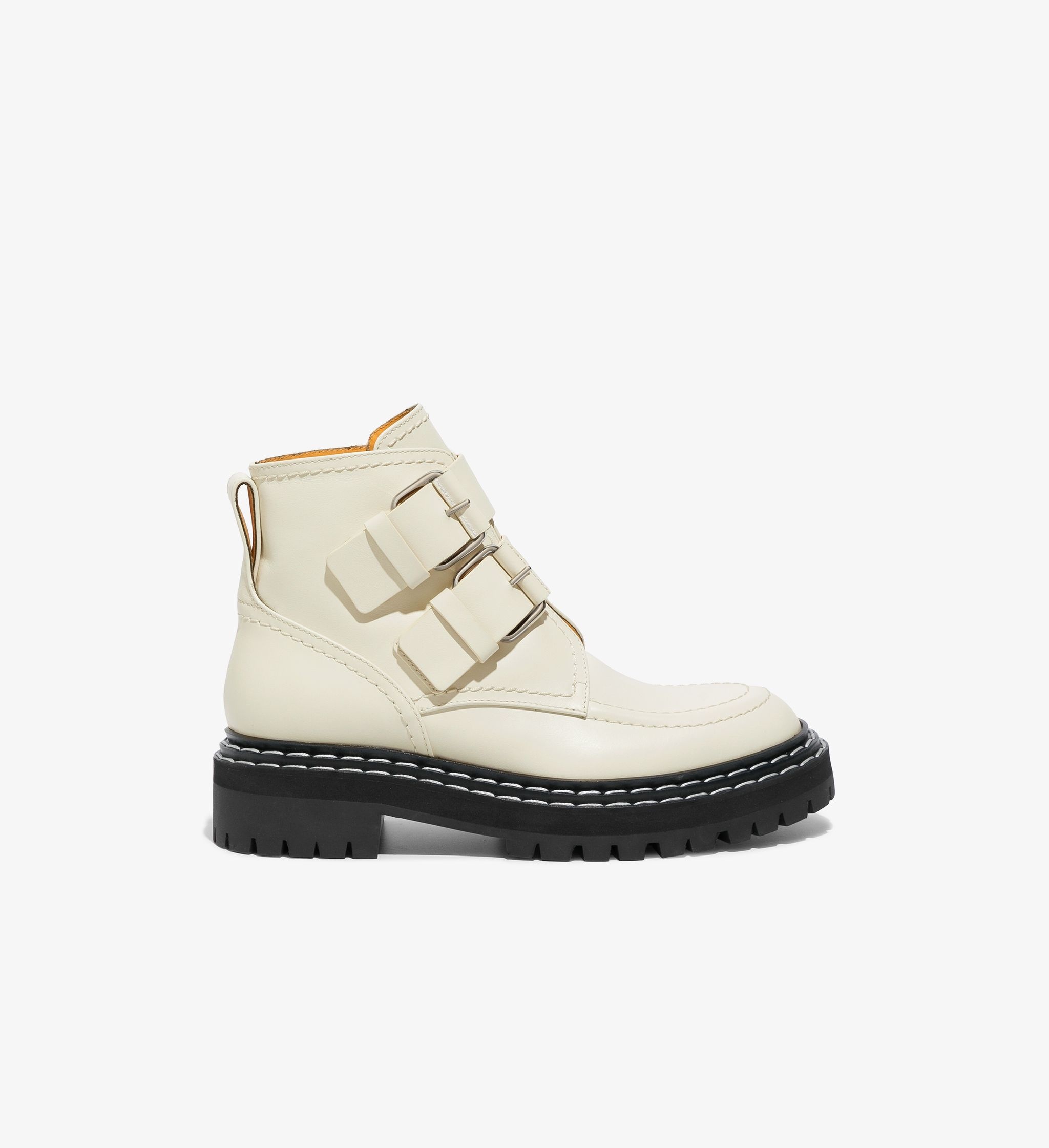 The Lug Sole Buckle Boots are crafted in smooth calf leather with a contrast yellow interior. Two front straps with buckle closures. Black high-definition rubberized lug sole with white topstitching. Round toe. Heel tab. Slip-on design. Made in Italy. Upper: calf leather Sole: rubber Heel height: 25 mm / 1" SKU: PS37251A15040111