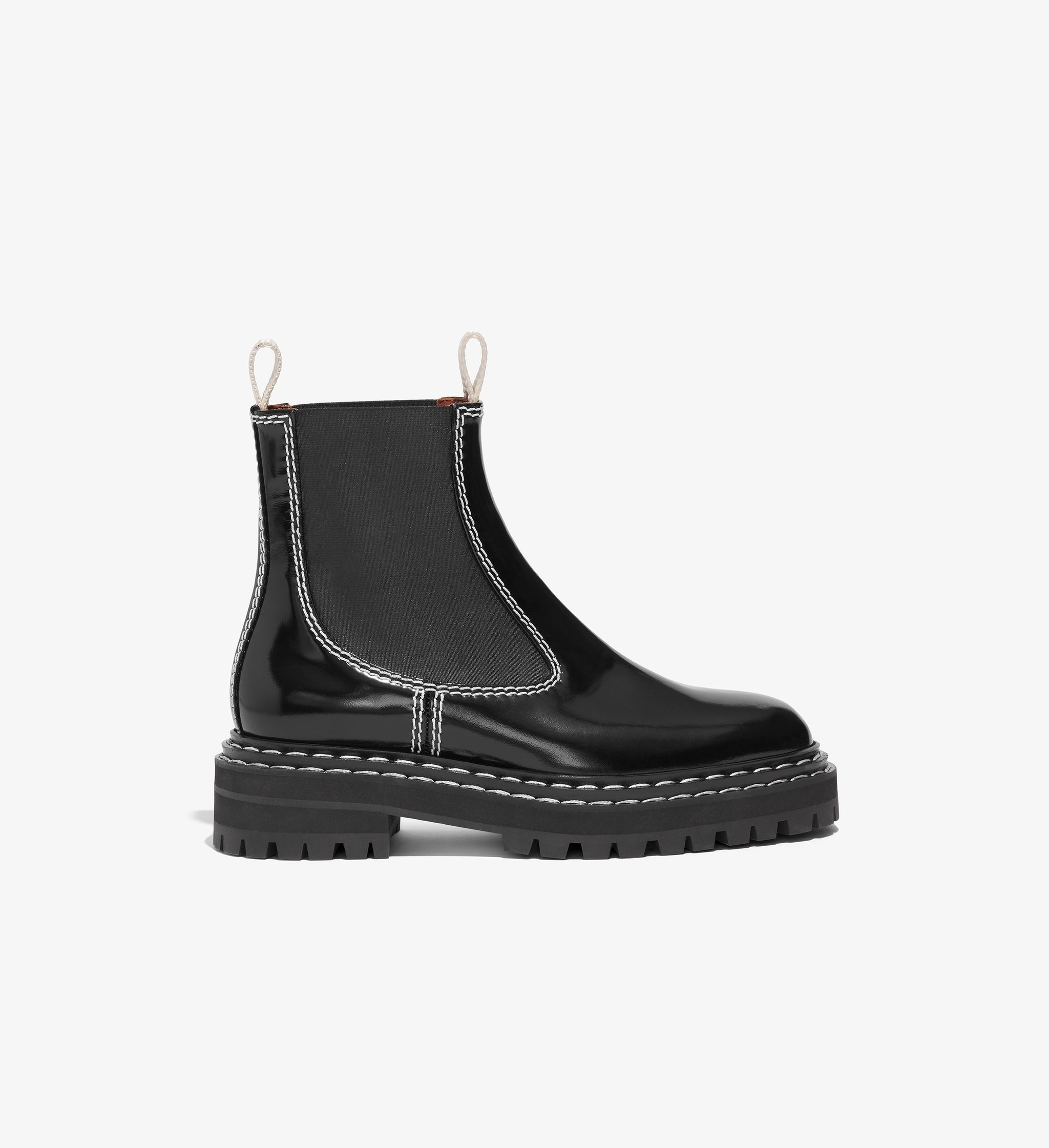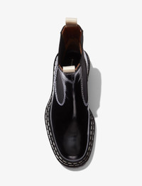 The Lug Sole Chelsea Boots are crafted in polished spazzolato leather to a slim silhouette with black elasticated side panels. Canvas pull tabs at the front and back. Lightweight rubberized tread sole with contrast topstitching. Slip-on design. Calf leather. Made in Italy. Upper: calf leather Sole: rubber Heel height: 25mm / 1" SKU: PS35115A16006999