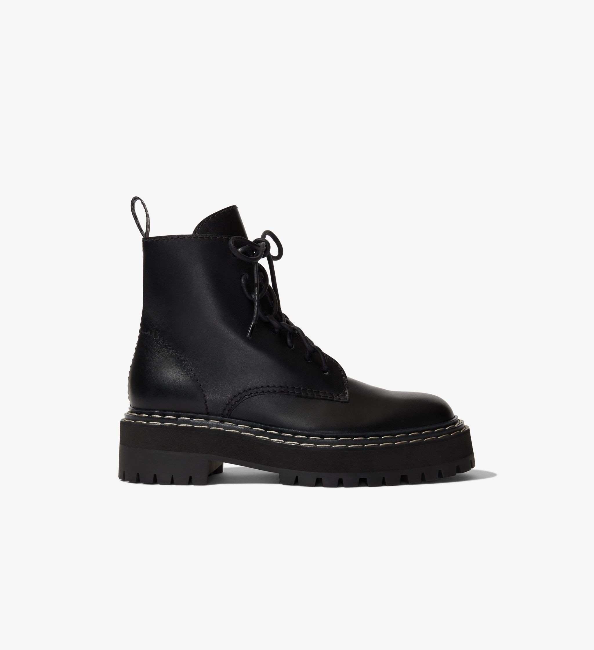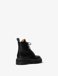 The Lug Sole Combat Boots are crafted from smooth leather with a whipstitch-inspired lace-up front. Featuring a canvas heel loop at the back and zip fastening, they rest on a lightweight rubberized tread sole. Black 25mm block heel Round toe Chunky rubber tread sole Zip side and lace-up front fastening Upper: 100% leather; sole: 100% rubber SKU: PS41113A18120999