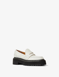 The Lug Sole Platform Loafers are crafted in calf leather to a classic penny silhouette and feature a top saddle strap. Framed by serrated edging at the tongue, they're set atop chunky platform lug soles with contrast topstitching. Details - Off-white - Tongue with serrated edge - Penny strap - Contrast topstitching - Round toe - Chunky platform sole - Upper: 100% calf leather; sole: 100% rubber - SKU: PS40104A17121120 Size & Fit True to Size Care - Upper: 100% calf leather; sole: 100% rubber - Please refer to care instructions provided with your order.