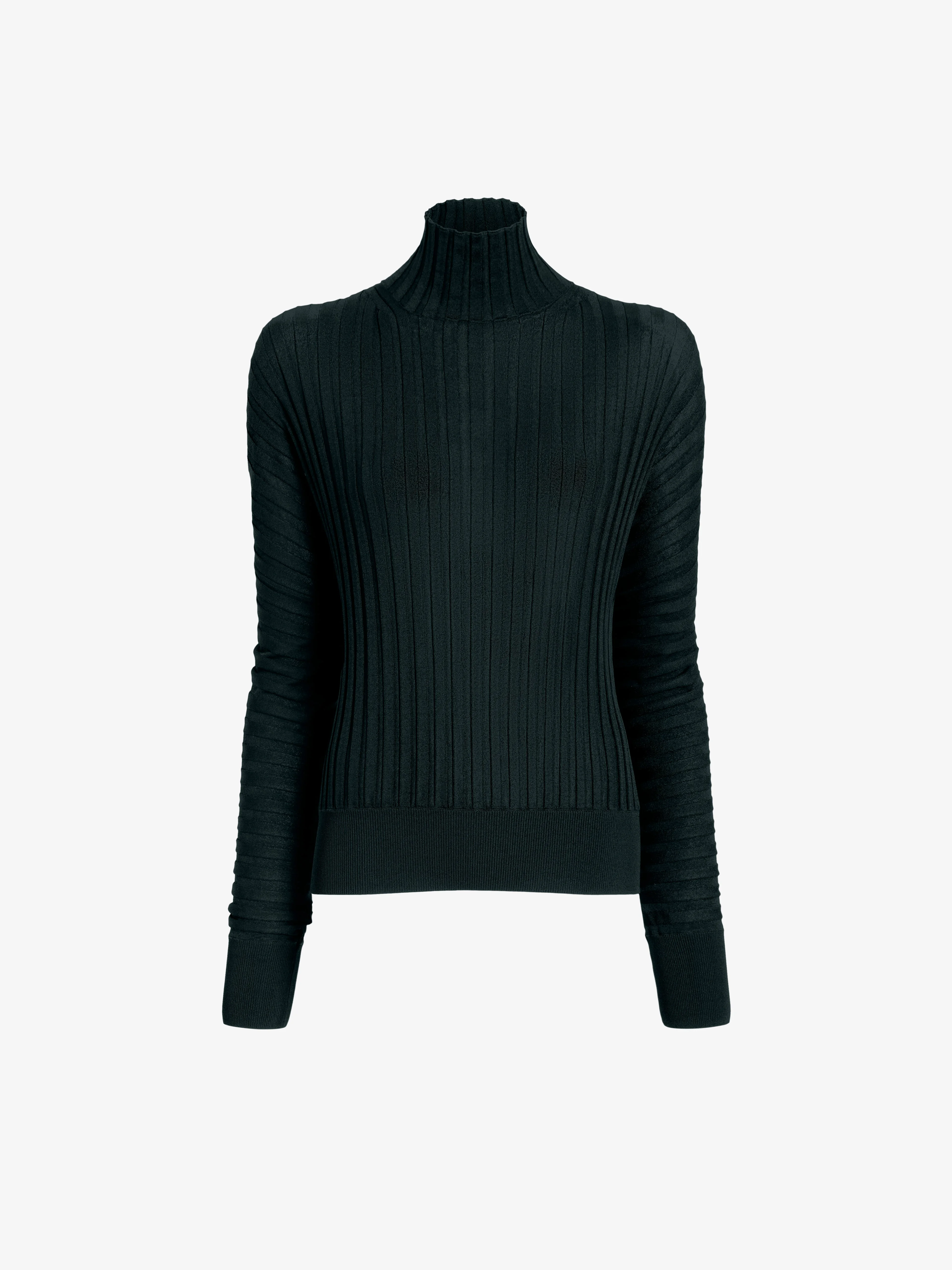 The Luiza Sweater in Sunburst Rib is crafted to a ribbed turtleneck silhouette, finished with thick knit trim. Details - Bottle green - Ribbed knit - High-rise - Layered construction - Straight hem - Slim silhouette - 80% viscose, 13% polyamide, 7% polyester - SKU: R2617325KY410302 Size & Fit - Model is 5'10.5'' with 31'' bust / 34.5'' hips. Wearing size Small Care - 80% viscose, 13% polyamide, 7% polyester - Dry clean only