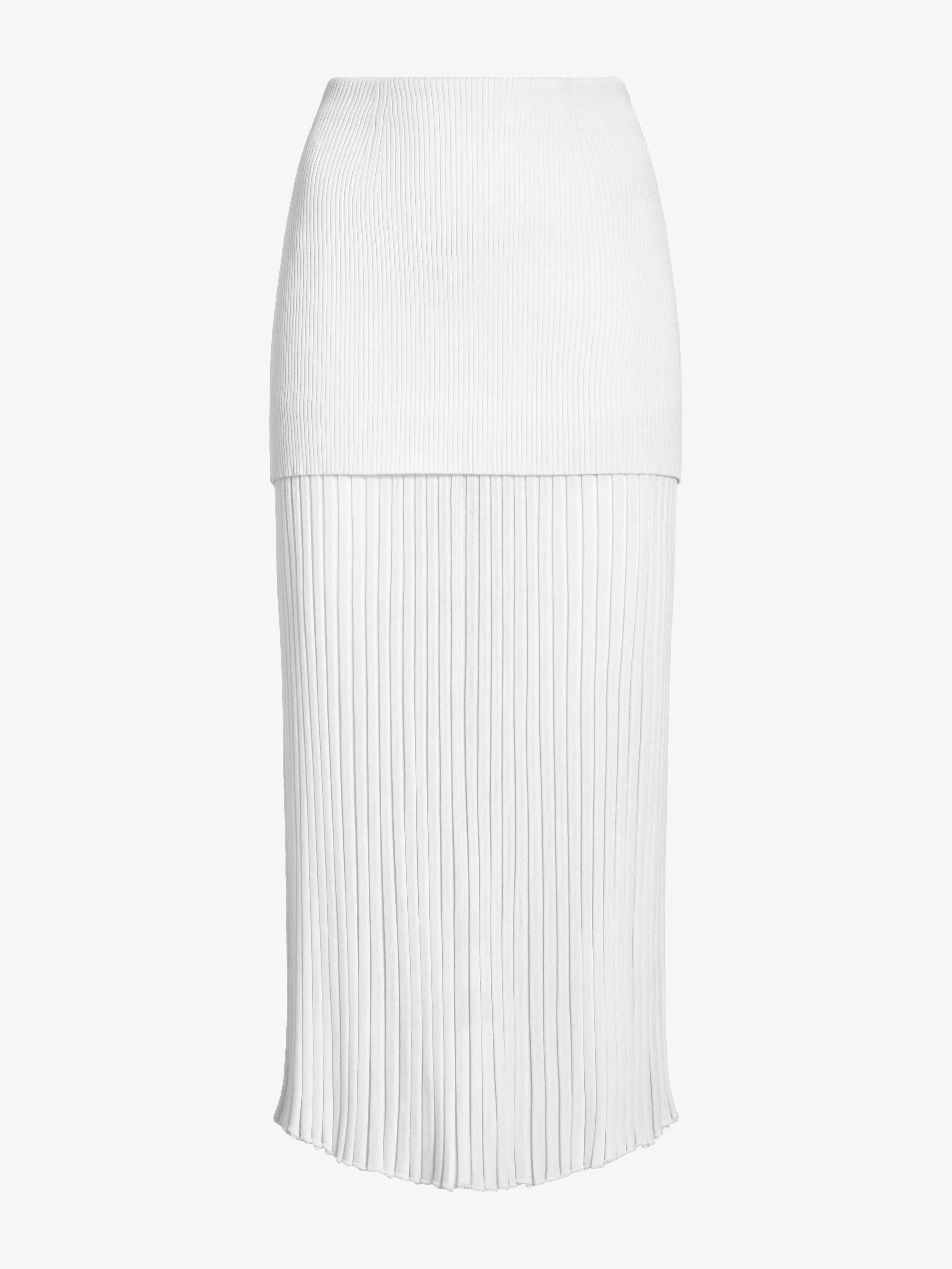 The Luiza Skirt in Sunburst Rib is crafted to create the illusion of layered construction. It features a compact ribbed upper panel paired with a sunburst ribbed lower hem that adds fluid movement. Details - White - Ribbed knit - High-rise - Layered construction - Straight hem - Slim silhouette - 80% viscose, 13% polyamide, 7% polyester - SKU: R2617309KY410100 Size & Fit - Model is 5'10.5'' with 31'' bust / 34.5'' hips. Wearing size Small Care - 80% viscose, 13% polyamide, 7% polyester - Dry clean only