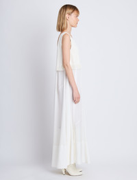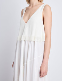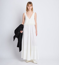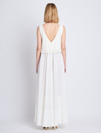 The Lynda Dress in Textured Marocaine With Boucle is a full-bodied maxi dress with a deep V-neckline. Complemented by an overlay top with soft fringe trim. Details • Off white • Deep V-neck • Top overlay with fringe trim • Full bodied skirt • Maxi length • Straight hem • Bodice: 88% viscose, 12% cupro; Skirt: 100% viscose • SKU: R2413006BY293102 Size & Fit • Model is 5'10'' with 31.5'' bust / 35'' hips. Wearing size 4 Care • Bodice: 88% viscose, 12% cupro; Skirt: 100% viscose • Dry clean only