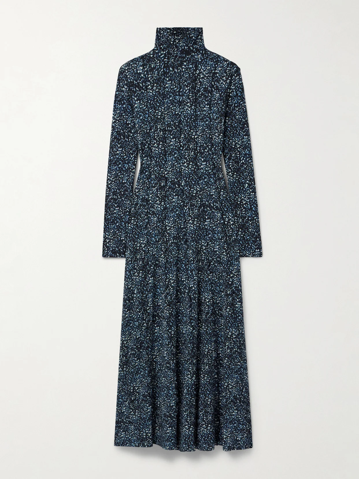 Proenza Schouler White Label's 'Mabel' dress is printed with tonal-navy cheetah spots. Cut from smooth jersey, it has a floaty skirt, a turtleneck and pretty ruffled lettuce edges.