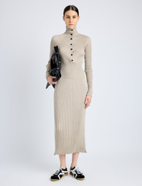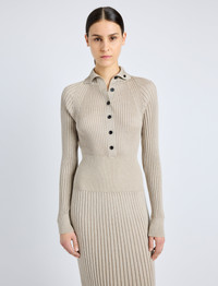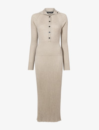 The Maeve Dress in Superfine Merino Silk is knitted to a slim silhouette that balloons at the waist to create a cinched effect. Features a buttoned upper bodice that can be worn undone for an open finish or closed for a high neck. Details - Taupe - Buttoned collar - Long sleeves - Cinched waistband - Straight hem - Slim silhouette - 69% wool, 27% silk, 4% polyamide - SKU: R2517216KW158253 Size & Fit - Model is 5'10'' with 32'' bust / 34'' hips. Wearing size Small Care - 69% wool, 27% silk, 4% polyamide - Dry clean only