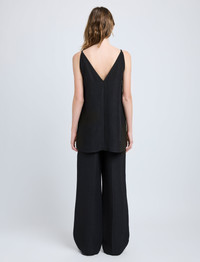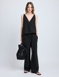 The Maggi Pant in Cotton Viscose Linen is crafted to a slouchy trouser with a center-stitched self-tie belt, side slip pockets, and a concealed front closure. Details - Black - Concealed front closure - Self-tie belt - Side slip pockets - Double belt loops - Wide leg - Relaxed fit - 51% viscose, 26% linen, 23% cotton - SKU: R2536001BY330001 Size & Fit - Model is 5'9.5'' with 32'' bust / 34'' hips. Wearing size 4 Care - 51% viscose, 26% linen, 23% cotton - Dry clean only