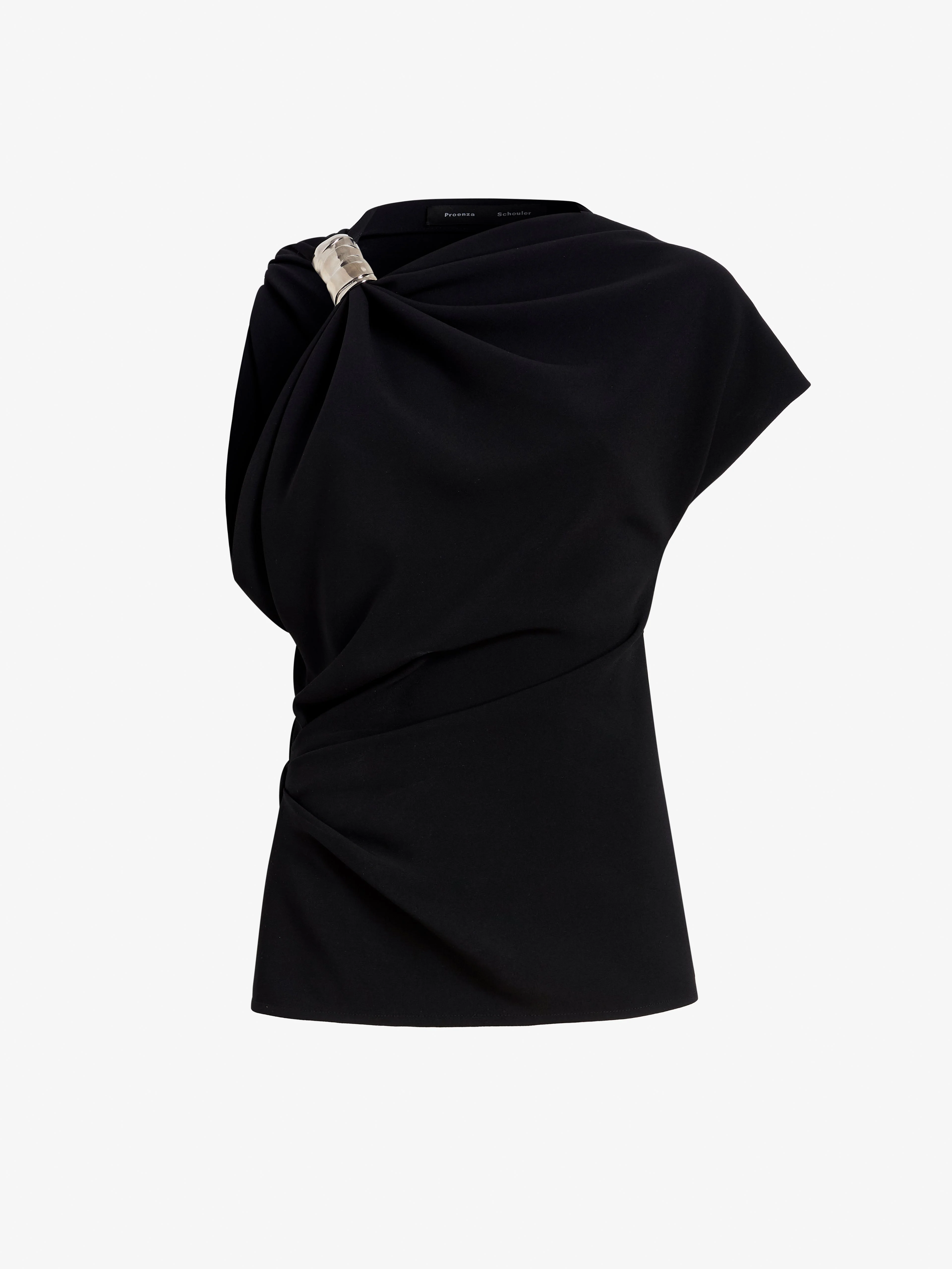 The Malika Top in Matte Double Crepe is designed with an asymmetric neckline and gathered drape, and features a sculptural shoulder detail accented by gold-toned hardware. Details - Black - Asymmetric neckline - Gathered drape - Gold-toned hardware - Straight hem - Slim silhouette - 70% triacetate, 30% polyester - SKU: R2544025BY116001 Size & Fit - Model is 5'11'' with 32'' bust / 34.5'' hips. Wearing size 4 Care - 70% triacetate, 30% polyester - Dry clean only