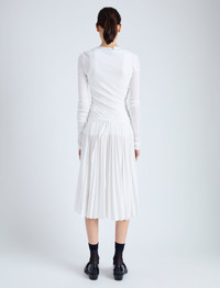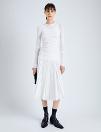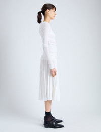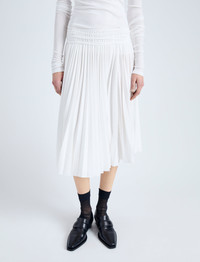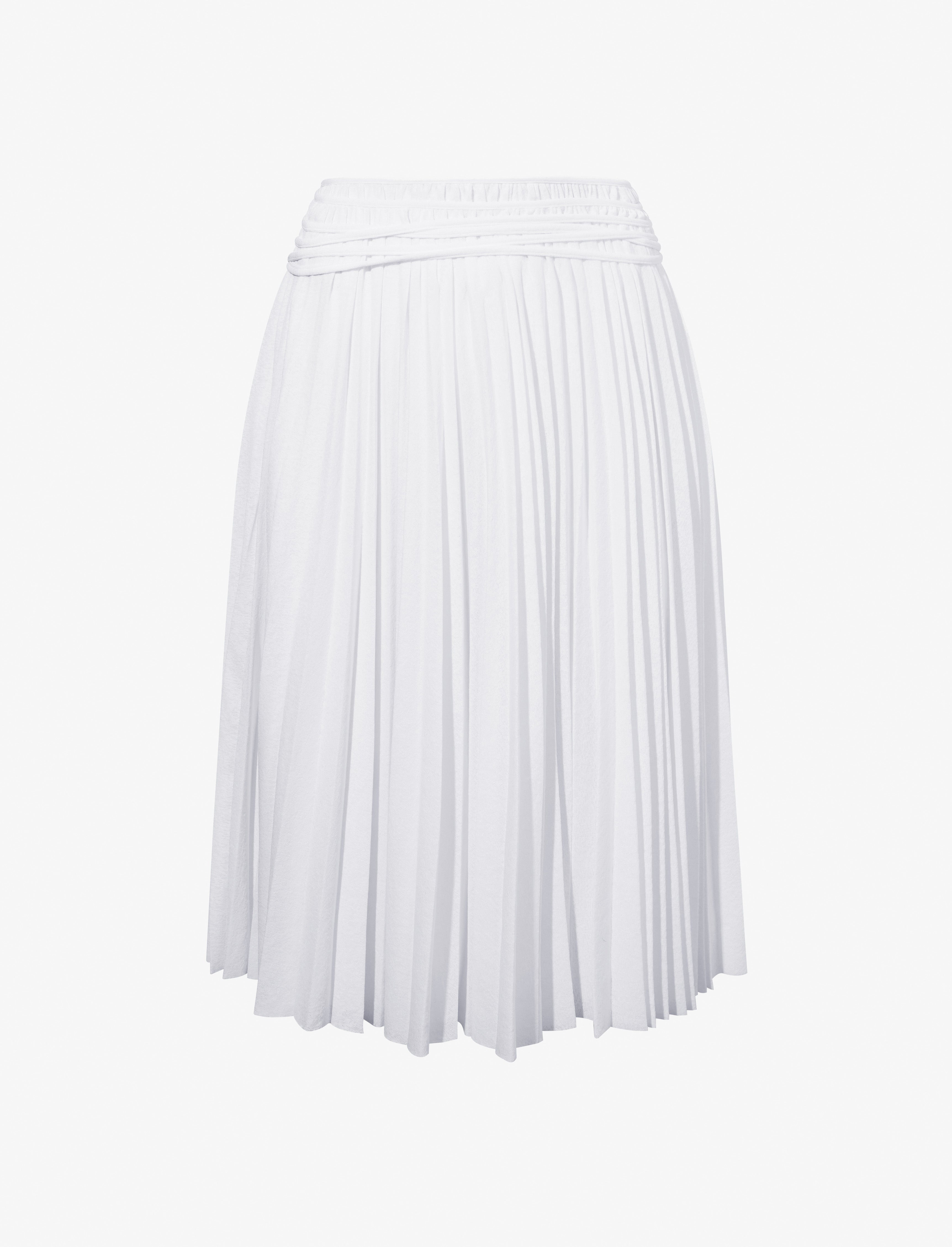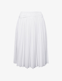 The Margo Skirt in Gauzy Jersey is crafted to a sheer low-rise skirt with micro pleating throughout. Completed with a thin wrap-around self-tie. Details - White - Sheer fabrication - Low-rise - Micro pleated - Thin self-tie - Below the knee length - Slim fit - 100% polyester - SKU: R2435006JY108100 Size & Fit - Model is 5'10'' with 32'' bust / 34'' hips. Wearing size 4 Care - 100% polyester - Dry clean only