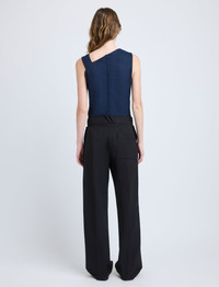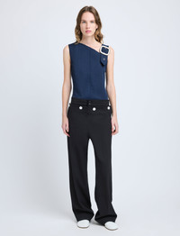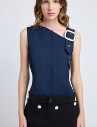 The Marin Top in Technical Nylon Jacquard is crafted to a slim silhouette with an asymmetrical neckline and buckle shoulder detail. Details - Midnight - Striped jacquard - Asymmetric neckline - Sleeveless - Buckle shoulder detail - Brushed nickel hardware finish - Concealed zipper closure - Slim fit - 100% polyester - SKU: R2524019JQ114401 Size & Fit - Model is 5'9.5'' with 32'' bust / 34'' hips. Wearing size 4 Care - 100% polyester - Dry clean only