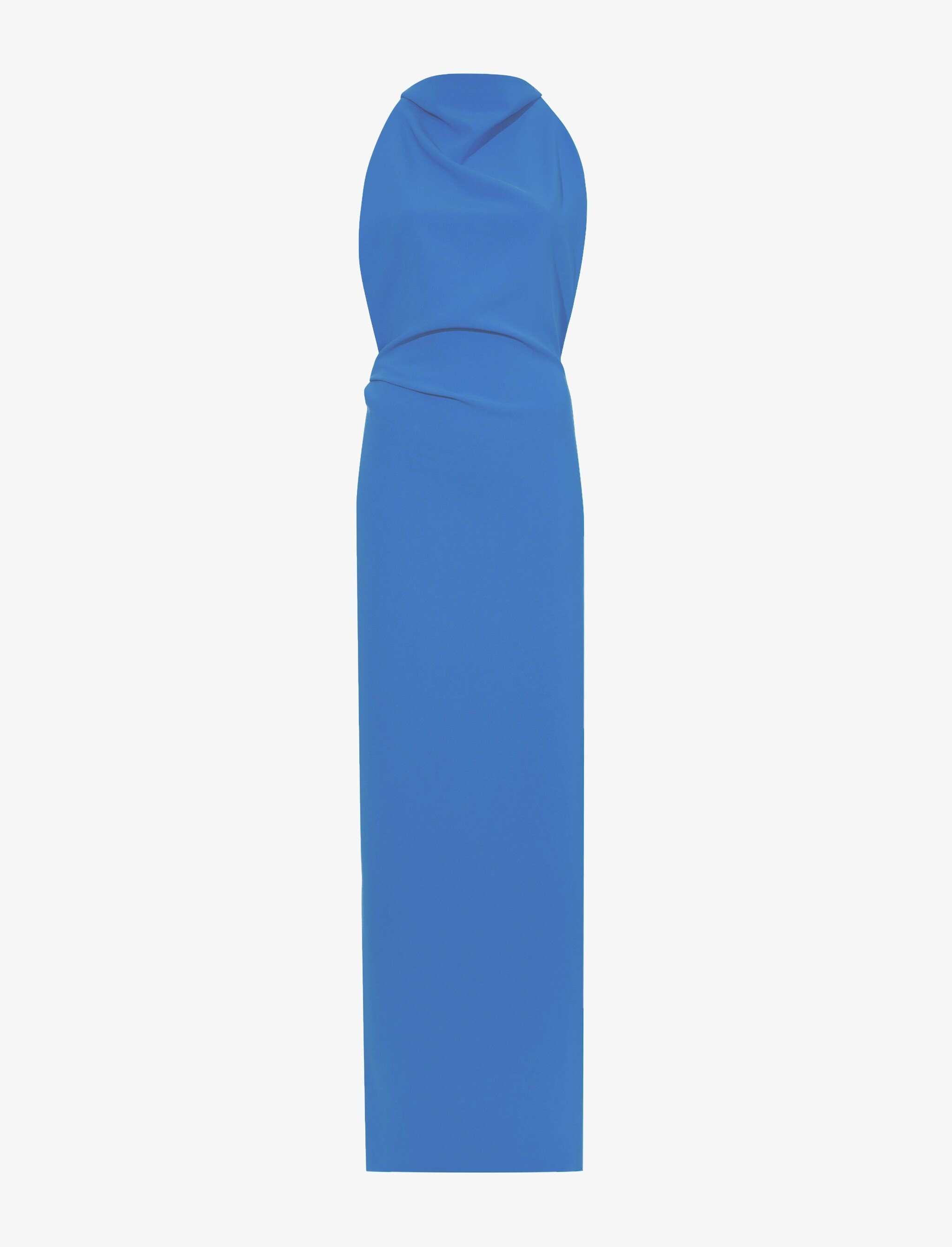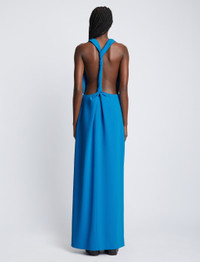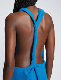 The Matte Crepe Backless Dress in turquoise is cut in matte crepe with a fluid drape. Features a mock neck and a single twisted strap at the center-back. Maxi-length hem with a side slit. Invisible side zip closure. Slim fit. 70% triacetate, 30% polyester. SKU: R2323004BY116442