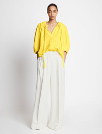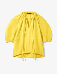 The Matte Crepe V-Neck Top in yellow is cut in crepe to a relaxed silhouette and features a gathered neckline with knotted cord ties. Voluminous elbow-length sleeves. Center-front placket. 70% triacetate, 30% polyester. SKU: R2234013BY116700