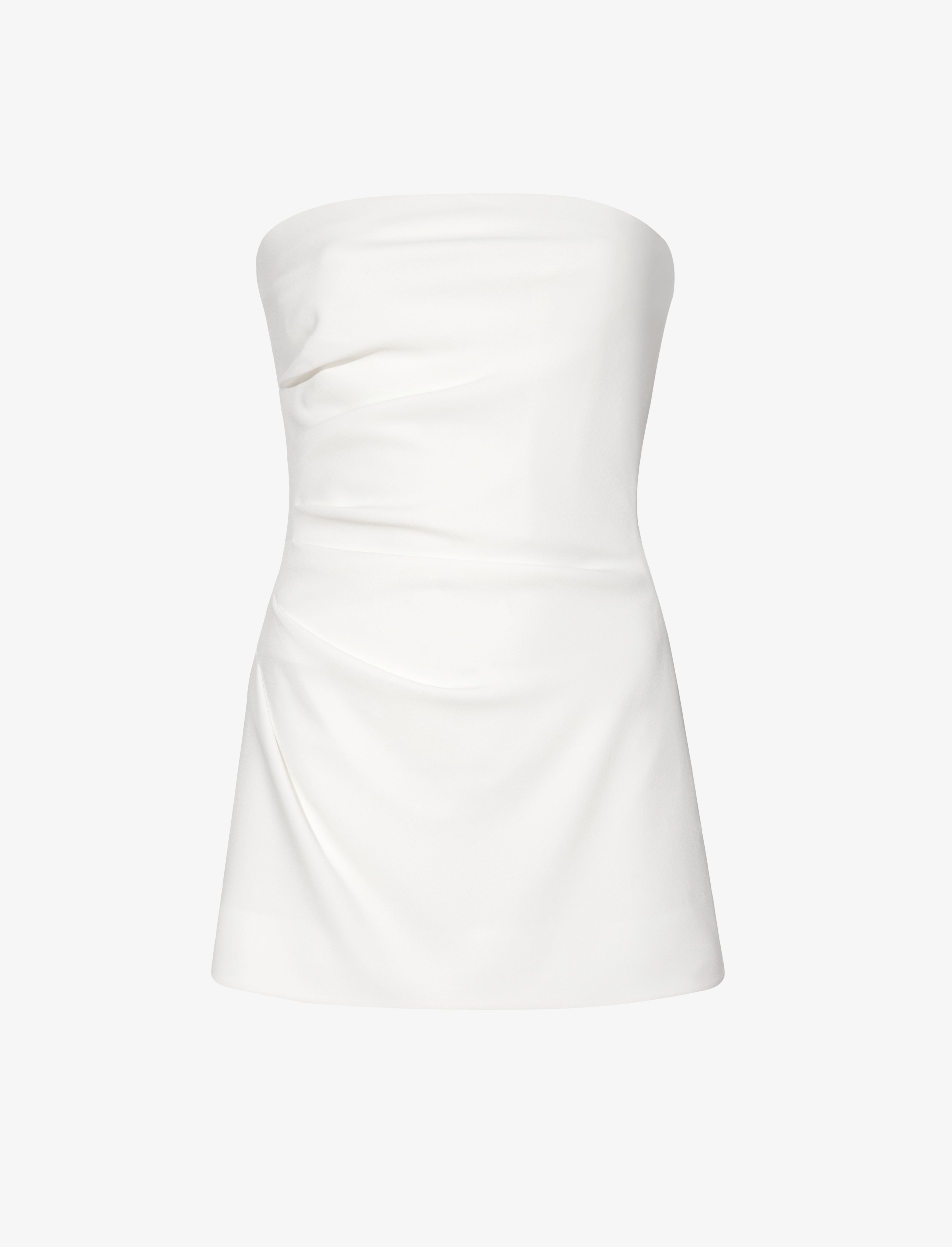 The is cut to a slim strapless silhouette that nips in at the waist with side pleats. Details - White - Matte finish - Straight neck - Strapless - Side pleats - Straight hem - Concealed zip side fastening - Slim fit - 70% triacetate, 30% polyester - SKU: R2334030BBY116100 Size & Fit - Model is 5'10"; with 31.5"; bust / 35"; hips. Wearing size 4 Care - 70% triacetate, 30% polyester - Dry clean only