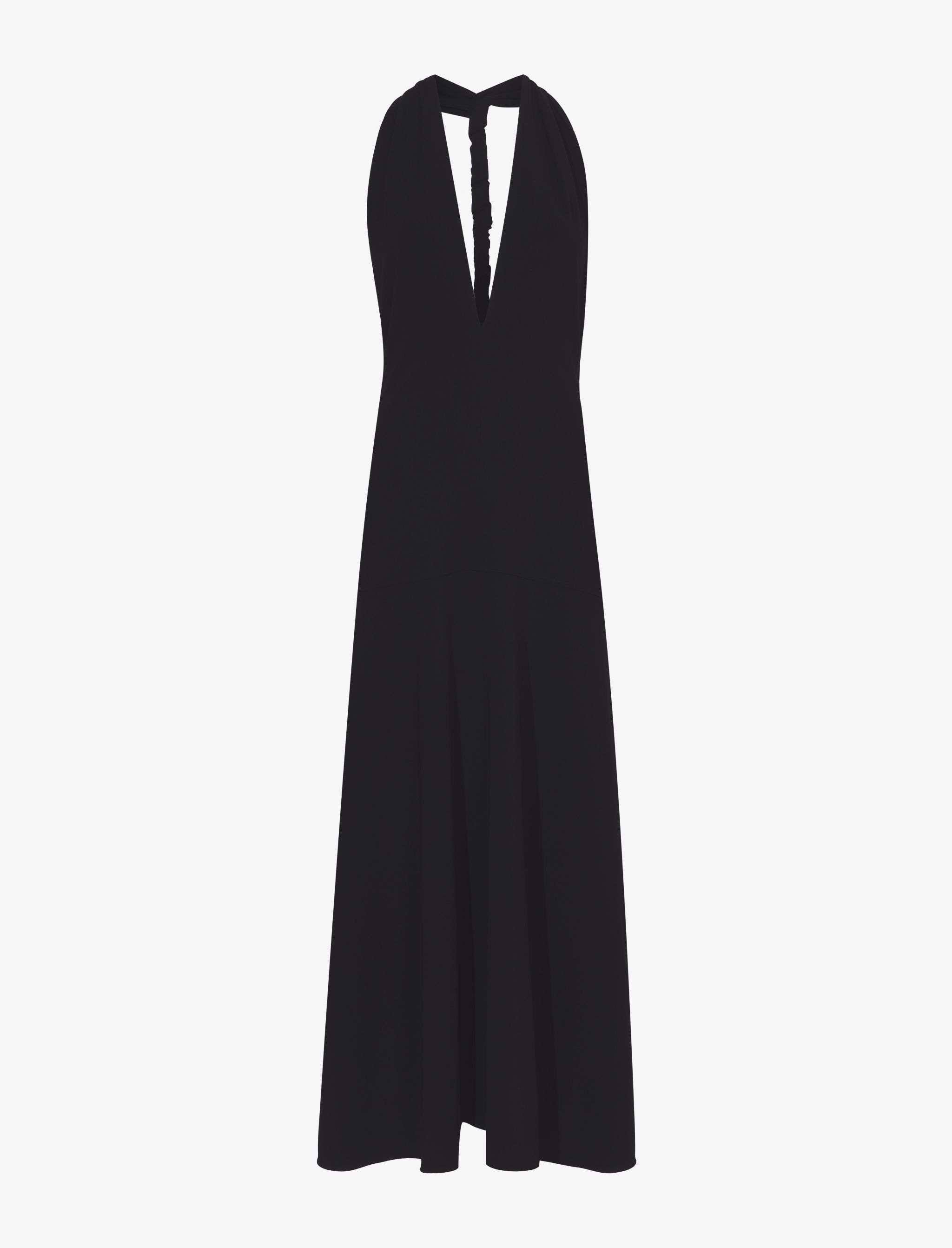 The Matte Viscose Crepe Twist Back Dress is cut to a draped A-line silhouette that twists into a single strap at the back. Finished with a plunging V-neck and ankle-length hem. Black Plunging V-neck Sleeveless Backless Twisted strap at back Concealed slip side pockets Straight maxi-length hem Slim fit 70% triacetate, 30% polyester; lining: 100% viscose SKU: R2333017BY116001