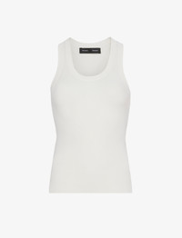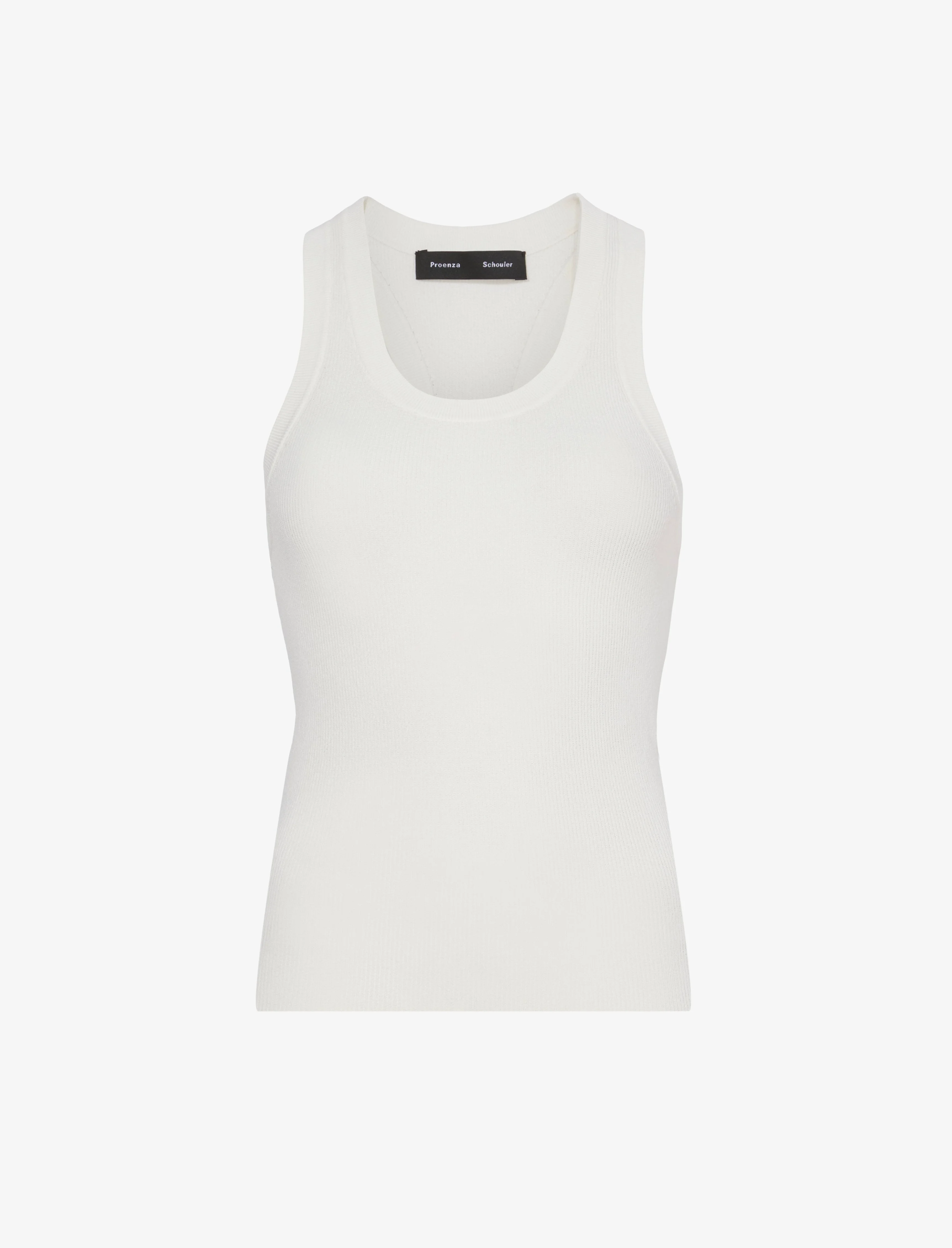 The Roberts Knit Tank in Matte Viscose Rib is rib-knitted to a slim silhouette and features a racerback. Details • White • Ribbed knit • Scoop neck • Sleeveless • Racerback • Straight hem • Slim fit • 83% viscose, 17% polyester • SKU: R2337086KY283100 Size & Fit • Model is 5'10" with 31.5" bust / 35" hips. Wearing size Small Care • 83% viscose, 17% polyester • Dry clean only