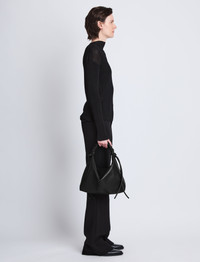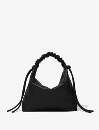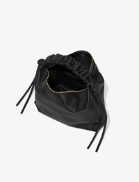 The Medium Drawstring Shoulder Bag is crafted in smooth leather to a slouchy silhouette with a single ruched top handle. It's fitted with a zip fastening and stamped with a signature logo at the front. Details • Black • Ruched top handle • Zip top fastening • Knotted ties • Logo at front • Silver-tone metal hardware • 100% lambskin • Made in Italy • SKU: HB241032L003G001 Size & Fit • W: 34cm x H: 33cm x D: 21cm • Top Handle Length: 20.5cm Care • 100% lambskin • Our bags are hand crafted using genuine leather. Variations in tone, marks or grain are common and should not be considered imperfections. Like all natural materials, leather reacts to the atmosphere. Humidity, rain, and sunlight can damage leather. Should a slight white coating appear on the surface of the leather, it can easily be removed using a dry cloth. Should the leather get wet, please absorb the water immediately with a dry cloth. Overexposure to sunlight can stain or alter the color of the leather.