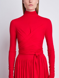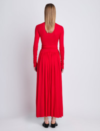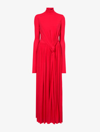 Details • Scarlet red • Crepe jersey • Turtleneck • Extended long sleeves • Gathered knot at front • Pleated skirt • Straight maxi-length hem • Concealed back fastening • Slim fit • 100% viscose • SKU: R2413016JY092600 Size & Fit • Model is 5'11'' with 32'' bust / 35'' hips. Wearing size 4 Care • 100% viscose • Dry clean only