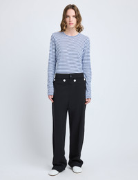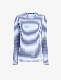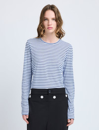 The Mia T-Shirt in Cotton Stripe Jersey is cut from an ultra-soft jersey with all-over stripes. Featuring a relaxed silhouette with a crew neckline and long sleeves. Details - Chambray multi - Striped jersey - Crew neckline - Long sleeves - Straight hem - Slim fit - 77% cotton, 23% linen - SKU: R2524021JC179470 Size & Fit - Model is 5'9.5'' with 32'' bust / 34'' hips. Wearing size Small Care - 77% cotton, 23% linen - Dry clean only