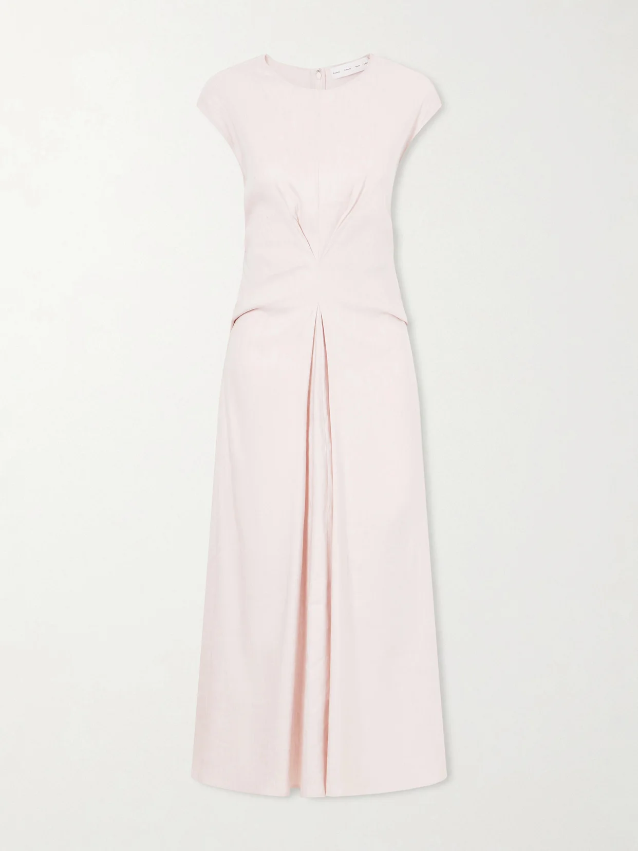 Proenza Schouler White Label's ‘Miranda' dress is defined by artful pleating that draws the eye through the bodice. Cut from a breathable linen with a hint of stretch in a soft blush hue, it falls to a fluid silhouette framed by cap sleeves.
