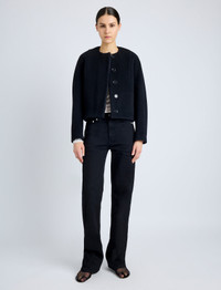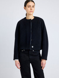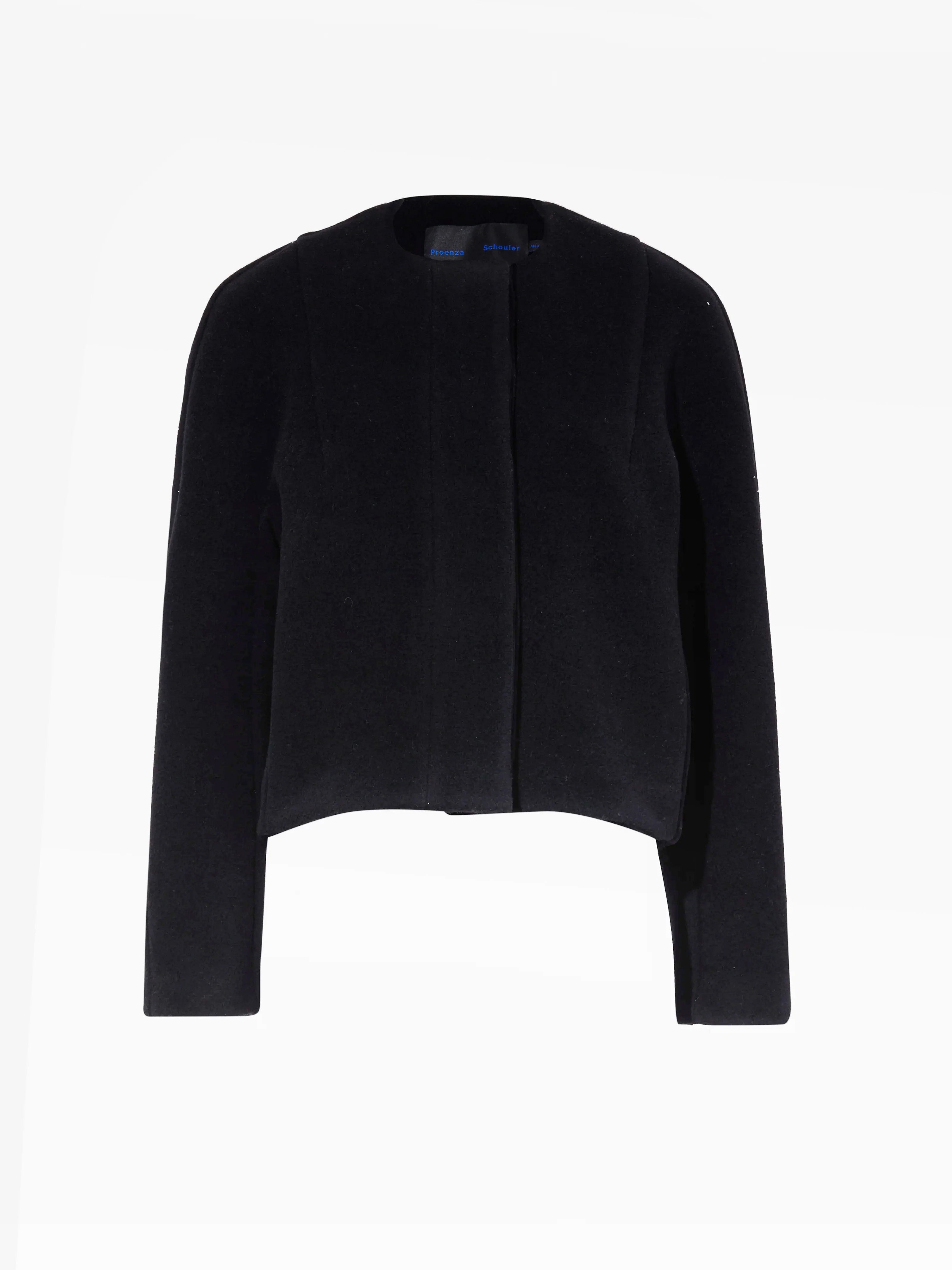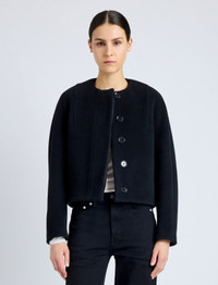 The Mona Jacket in Eco Double Face Wool is crafted to a slightly cropped silhouette with a crew neckline, kimono sleeves, and a concealed button placket. Details - Black - Crew neck - Kimono sleeve - Concealed placket - Tonal button closures - Slightly cropped finish - Straight hem - Slim silhouette - 75% wool, 25% polyamide - SKU: R2442004AW147001 Size & Fit - Model is 5'9'' with 30'' bust / 34.5'' hips. Wearing size 4 Care - 75% wool, 25% polyamide - Dry clean only