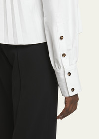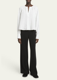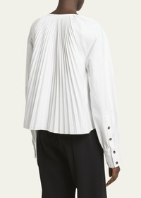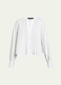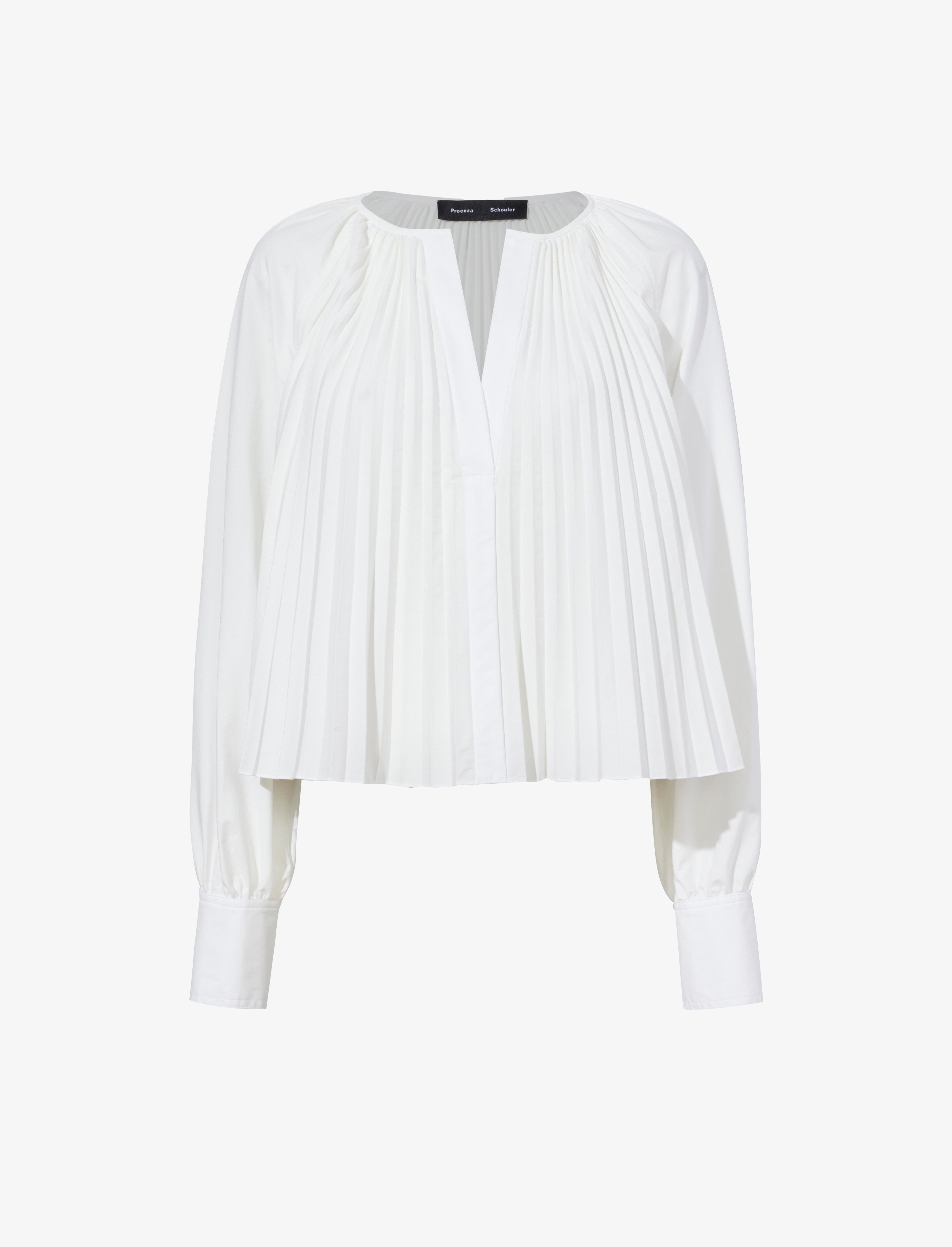 The Monica Top in Compact Poplin features a relaxed silhouette with pressed knife pleats throughout. Finished with a V-neckline, blouson sleeves and buttoned sleeve cuffs. Details - White - V-neck - Blouson sleeve - Button sleeve cuffs - Knife pleats - Relaxed fit - 96% cotton, 4% elastane - SKU: R2434001SC083100 Size & Fit - Model is 5'11'' with 31.5'' bust / 34'' hips. Wearing size 4 Care - 96% cotton, 4% elastane - Dry clean only