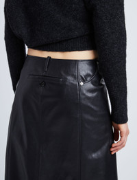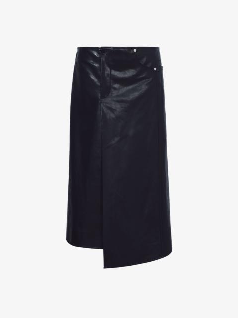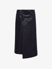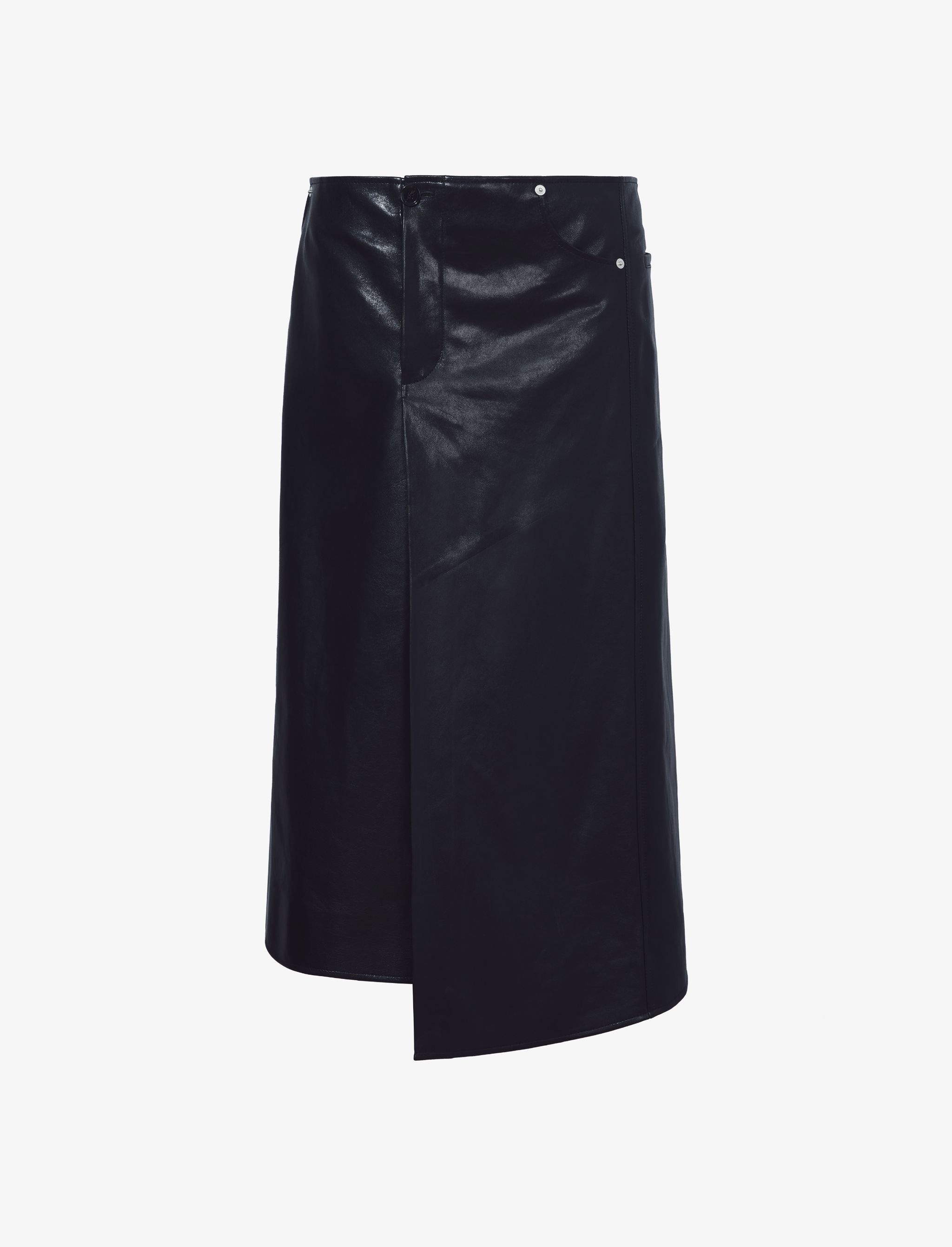 Fall 23 Runway Collection | Look 19 The Nappa Leather Skirt is cut from supple lambskin leather to an A-line silhouette with an asymmetric wrap front. Featuring jean-like detailing, including a button and zip fastening, belt loops, pockets and silver-tone metal rivets. Black Mid-rise waist Belt loops Wrap front Slip side pockets with rivets Welt back pocket with button fastening Asymmetric mid-length hem Button and concealed zip off-centre front fastening 100% lambskin SKU: R2345001LR238S001