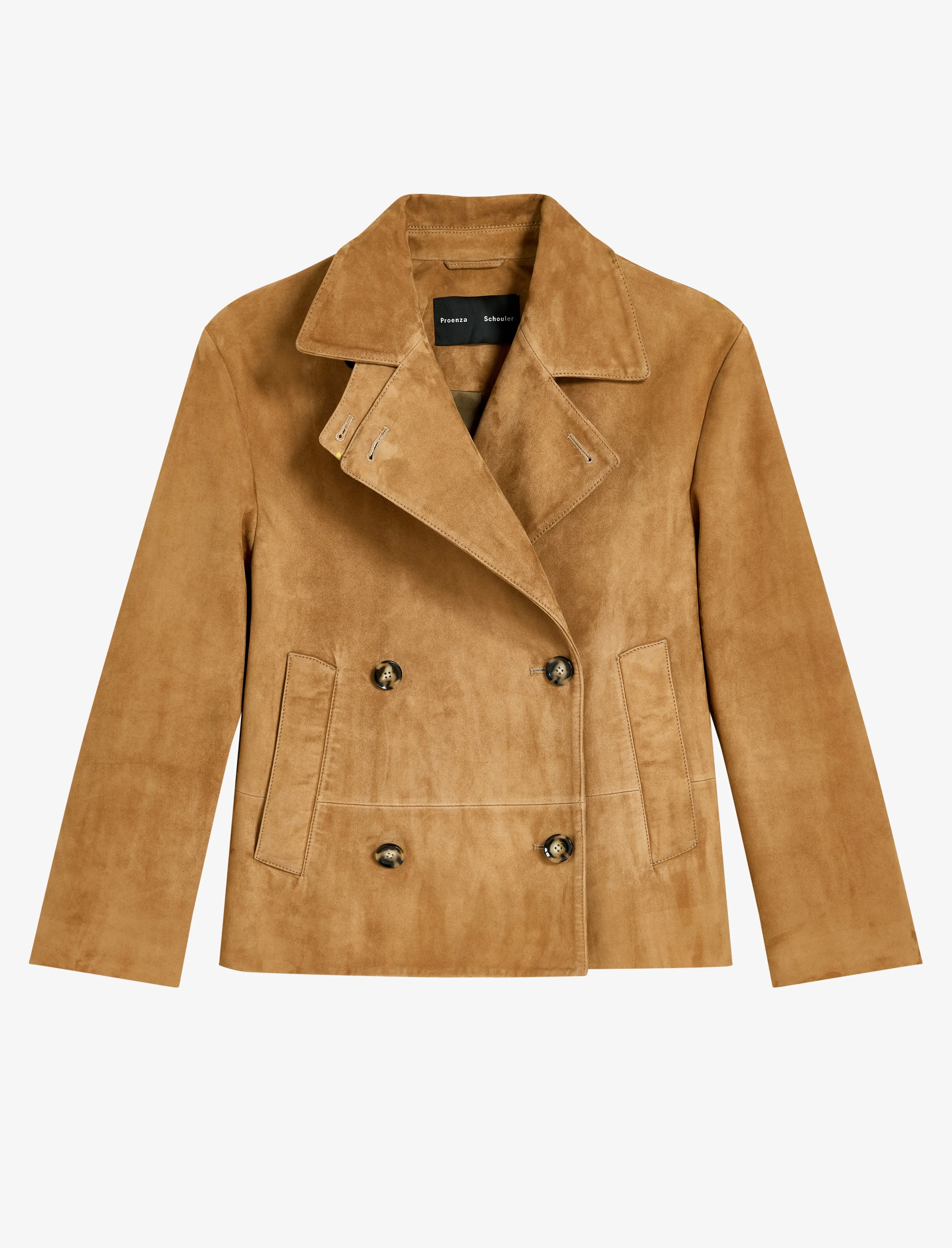 The Nola Jacket in Suede is tailored to a cropped trench silhouette, featuring notch lapels that can be styled as a stand collar when fastened with a removable storm guard at the neck. Finished with side welt pockets. Details - Pony - Peak lapels - Removable storm guard - Long sleeves - Triple-breasted closure - Side welt pockets - Back neck loop - Lined - Straight hem - 100% lambskin - SKU: R2532001LR278A239 Size & Fit - Model is 5'9.5'' with 32'' bust / 34'' hips. Wearing size 4 Care - 100% lambskin - Dry clean only