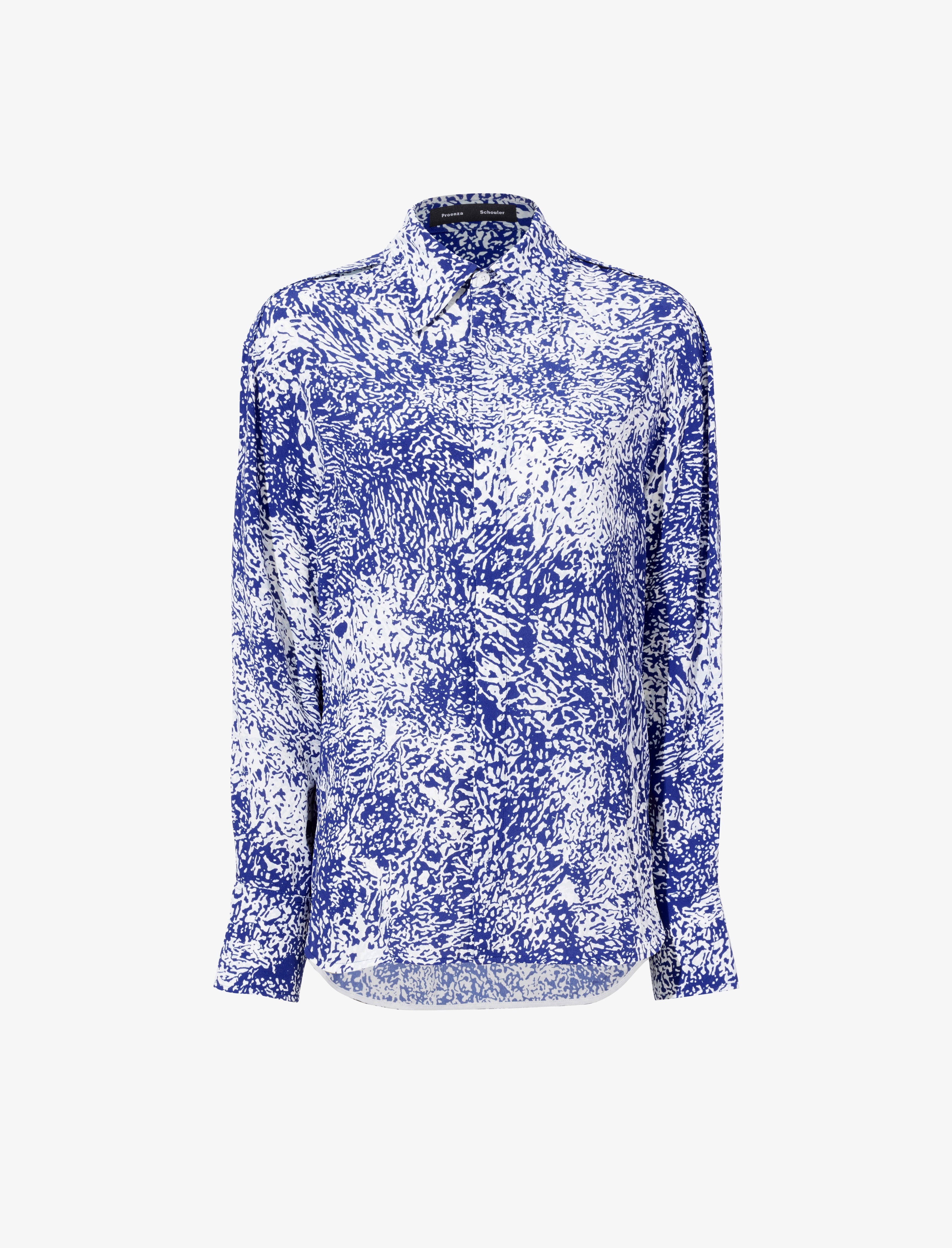 The Norman Top in Printed Viscose Crepe is tailored to a relaxed long sleeve silhouette with an all-over abstract motif. Completed with a point collar and concealed button placket. Details - Cobalt multi - Printed fabrication - Point collar - Long sleeve - Concealed button placket - Buttoned sleeve cuffs - Relaxed silhouette - 100% viscose - SKU: R2434005BYP137433 Size & Fit - Model is 5'10'' with 29'' bust / 34'' hips. Wearing size 4 Care - 100% viscose - Dry clean only