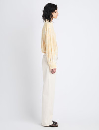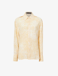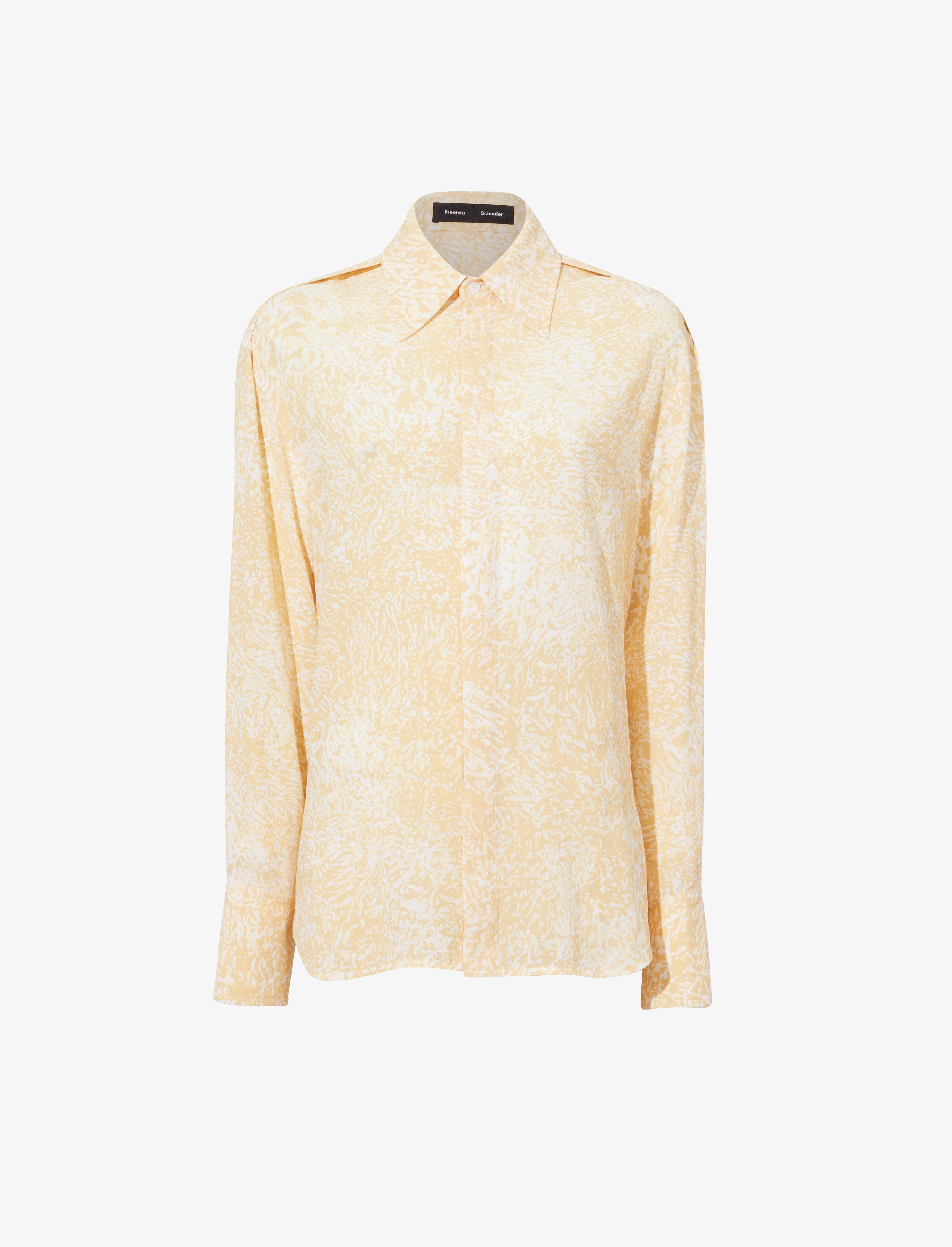 The Norman Top in Printed Viscose Crepe is tailored to a relaxed long sleeve silhouette with an all-over abstract motif. Completed with a point collar and concealed button placket. Details - Yellow multi - Printed fabrication - Point collar - Long sleeve - Concealed button placket - Buttoned sleeve cuffs - Relaxed silhouette - 100% viscose - SKU: R2434005BYP137970 Size & Fit - Model is 5'10'' with 29'' bust / 34'' hips. Wearing size 4 Care - 100% viscose - Dry clean only