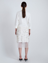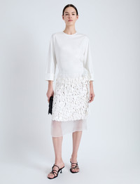 The Olson T-Shirt in Eco Cotton Jersey is cut to a long sleeve silhouette with pre-folded sleeve cuffs. Finished with a crew neckline and tonal monogram detail at the front lower body. Details - White - Crew neck - Long sleeve - Tacked sleeve folds - Tonal monogram detail - Straight hem - Regular fit - 100% organic cotton - SKU: R2434017JC167100 Size & Fit - Model is 5'10'' with 31.5'' bust / 35'' hips. Wearing size Small Care - 100% organic cotton - Dry clean only