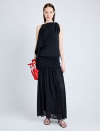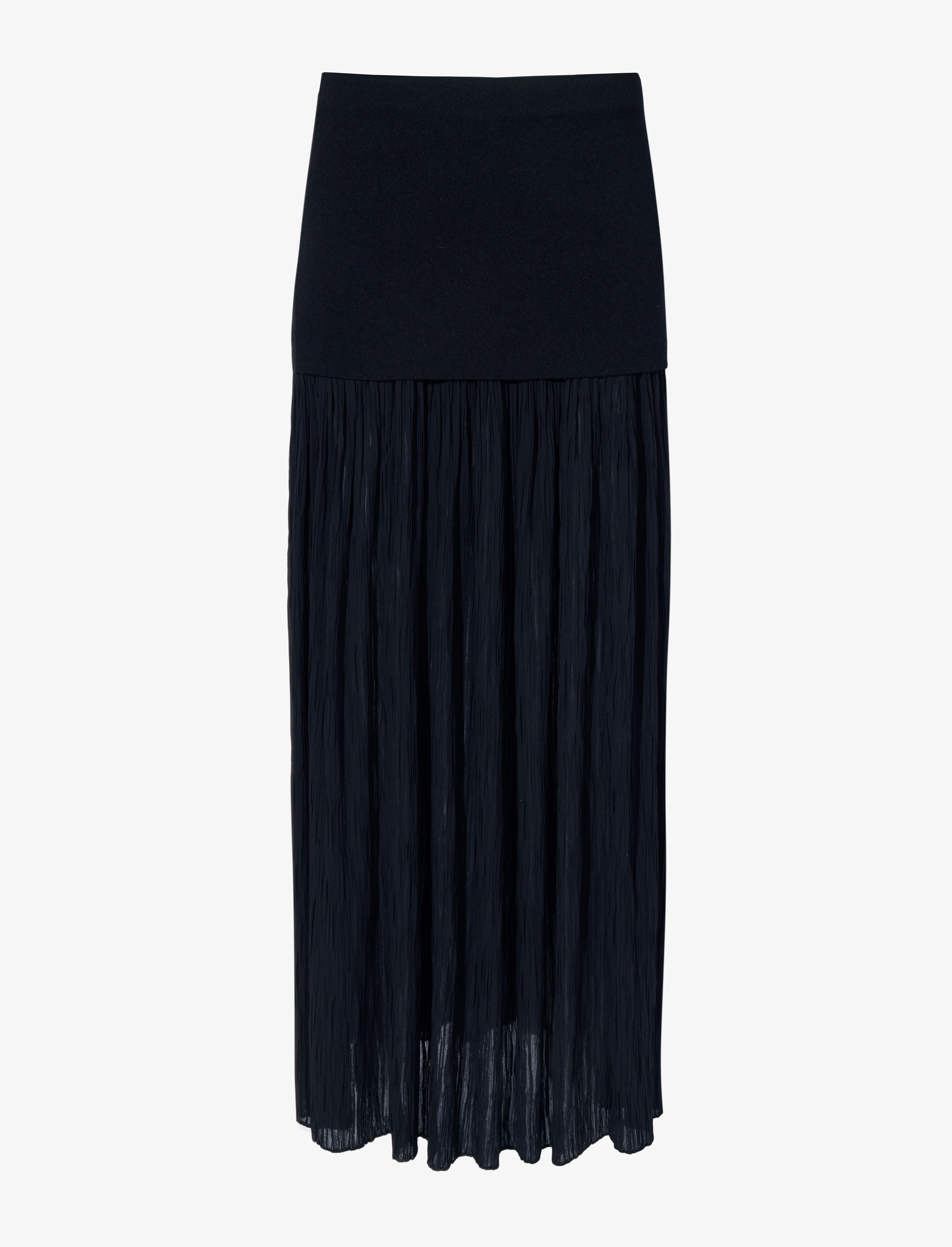 The Paige Skirt in Pleated Crepe Chiffon features a knitted upper panel paired with a sheer, texturally pleated lower skirt that adds movement to the silhouette. Details - Black - Knit upper panel - Sheer textured lower skirt - Ankle-length hem - Slim fit - 100% polyester - SKU: R2515004BY328001 Size & Fit - Model is 5'11'' with 31'' bust / 36'' hips. Wearing size 4 Care - 100% polyester - Dry clean only