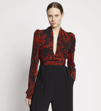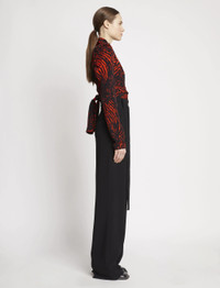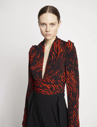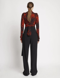 The Painted Spiral Crepe de Chine V-Neck Top is cut in crepe and features an all-over black and red spiral print. Plunging V-neck. Long sleeves with gathered shoulders and invisible zips at the cuffs. Fitted waist with extended wrap-around self-ties. 100% viscose. SKU: R2244022BYP137962