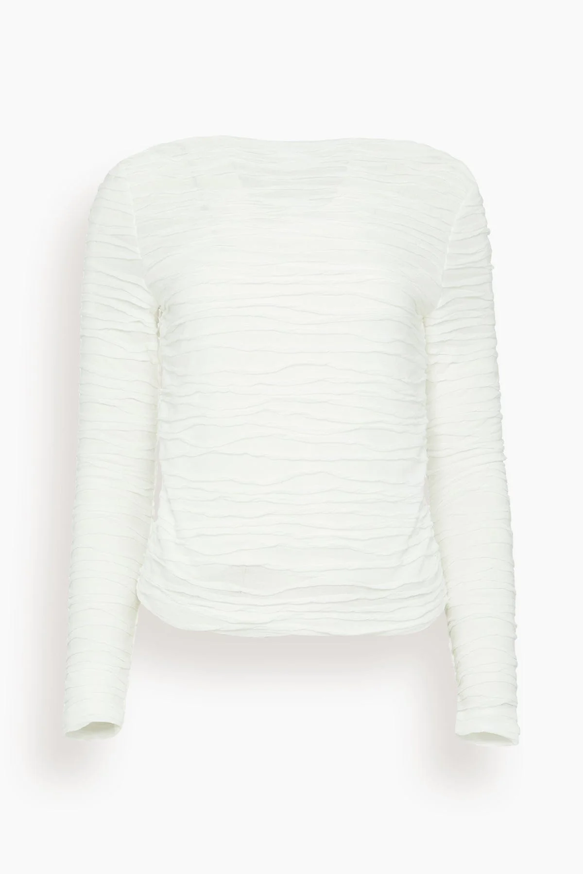 The Proenza Schouler Paloma Top in White Textured Cotton features a boat neckline and a sheer panel above the bust, with lining from the bust down. Detailed with tuck detailing throughout. FIT DESCRIPTION MODEL MEASUREMENTS - Fits true to size, take your normal size - Boat neckline - Long sleeves - Tuck-textured cotton jersey - Slim fit - Lined - 70% polyester, 30% rayon - Harriet is wearing a size XS - Bust: 32" - Waist: 24" - Hips: 30.5" - Height: 5’8.5”
