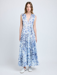 The Pat Dress in Printed Crinkle Chiffon is designed to a sleeveless silhouette with a deep V-neckline. Features a thin self-tie belt that can be tied at the front or back and includes a slip. Details - Off white multi - V-neckline - Sleeveless - Self-tie belt - Pleated skirt - Straight hem - Slim fit - Slip included - 100% polyester - SKU: R2533008BYP200120 Size & Fit - Model is 5'9.5'' with 32'' bust / 34'' hips. Wearing size 4 Care - 100% polyester - Dry clean only